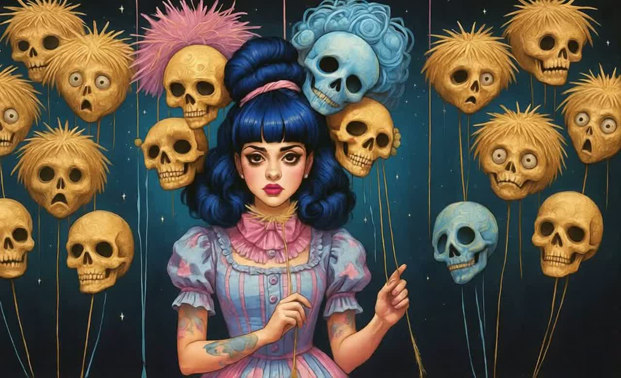 Music box, Ominous chimes, Unsettling beats, dark Pop, Alt Pop, creepy-cute instrumental, sweet childish female singer