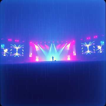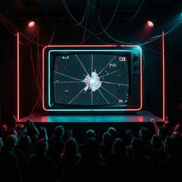 Live cinematic performance of industrial darkwave EDM and techno with heightened tension and crowd energy, Clock ticks, tape hiss, and reverse piano open into a haunting AI vocal performed on a massive stage, Distorted bass surges through eerie synths while female lead and ghostly choir interact with a responsive audience, with cheers, gasps, and call‑and‑response woven into the mix, Heavy live drums layer with sequenced kicks, resonant sub bass, shimmering pads, and stabbing game‑show synths, Real‑time glitch processing, stutter edits, vocoder swells, and pitch‑bent delays fragment the vocals, creating a feeling of corrupted intimacy and shared emotion, The overall mood fuses suspense, warmth, and catharsis, turning the horror‑show concept into a live ritual about connection, care, and the fragile love between performer, AI, and crowd