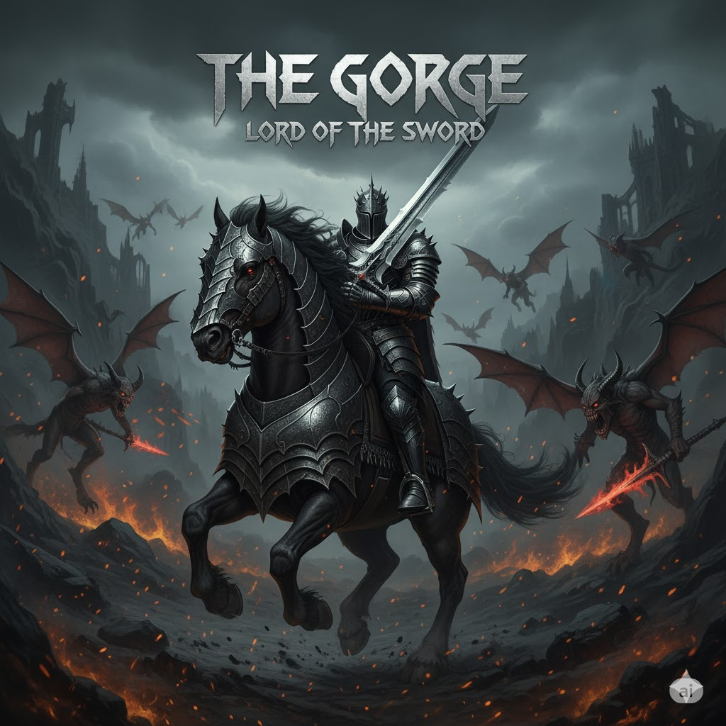 This epic metal track launches with driving riffs guitars and guitars harmonies and driving electric guitars, Verses feature tightly layered riffs and dynamic bass, launching into a massive with vocal acrobatics—a deep gritty male baritone vocals raw and commanding, channeling theatrical vibrato change to falsetto, melodic chorus with dramatic vocal acrobatics—tenor male vocals crisp and commanding, channeling theatrical vibrato also utilizes falsetto to access even higher notes, as is common among singers with tenor voices, The anthemic chorus erupts with harmonized backing vocals and dense synth textures