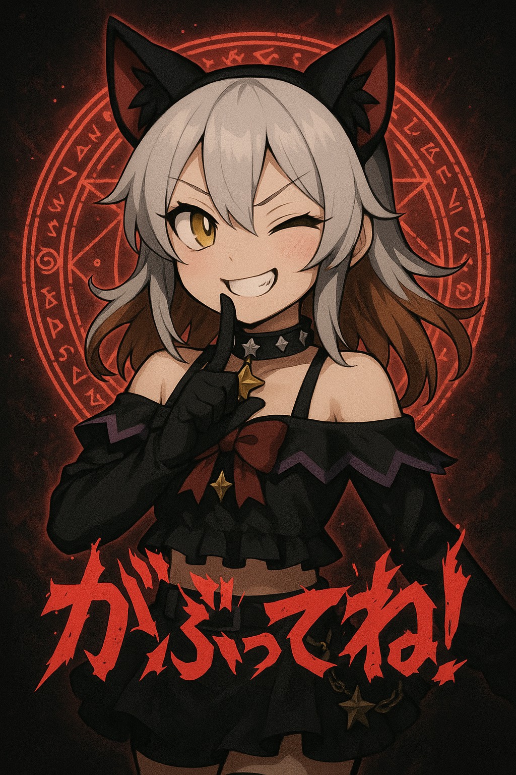 hard EDM, BPM 160, intense, aggressive, playful but fierce, cute female Japanese vocal, no harmony vocals, distorted synths, heavy hard bass, sharp kicks, glitchy leads, nighttime rave chaos
