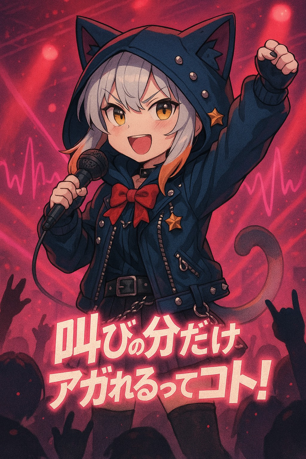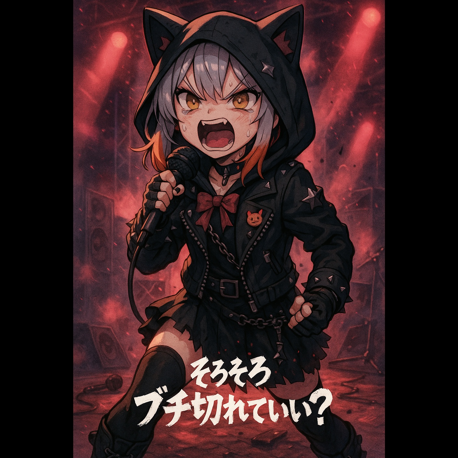 J-pop punk rock, aggressive female vocal, distorted guitars, fast tempo (BPM 170), emotional outbursts, shout and whisper mix, Japanese lyrics, rebellious and chaotic, glitchy effects, raw energy, cat