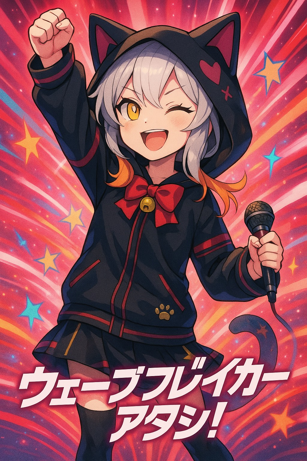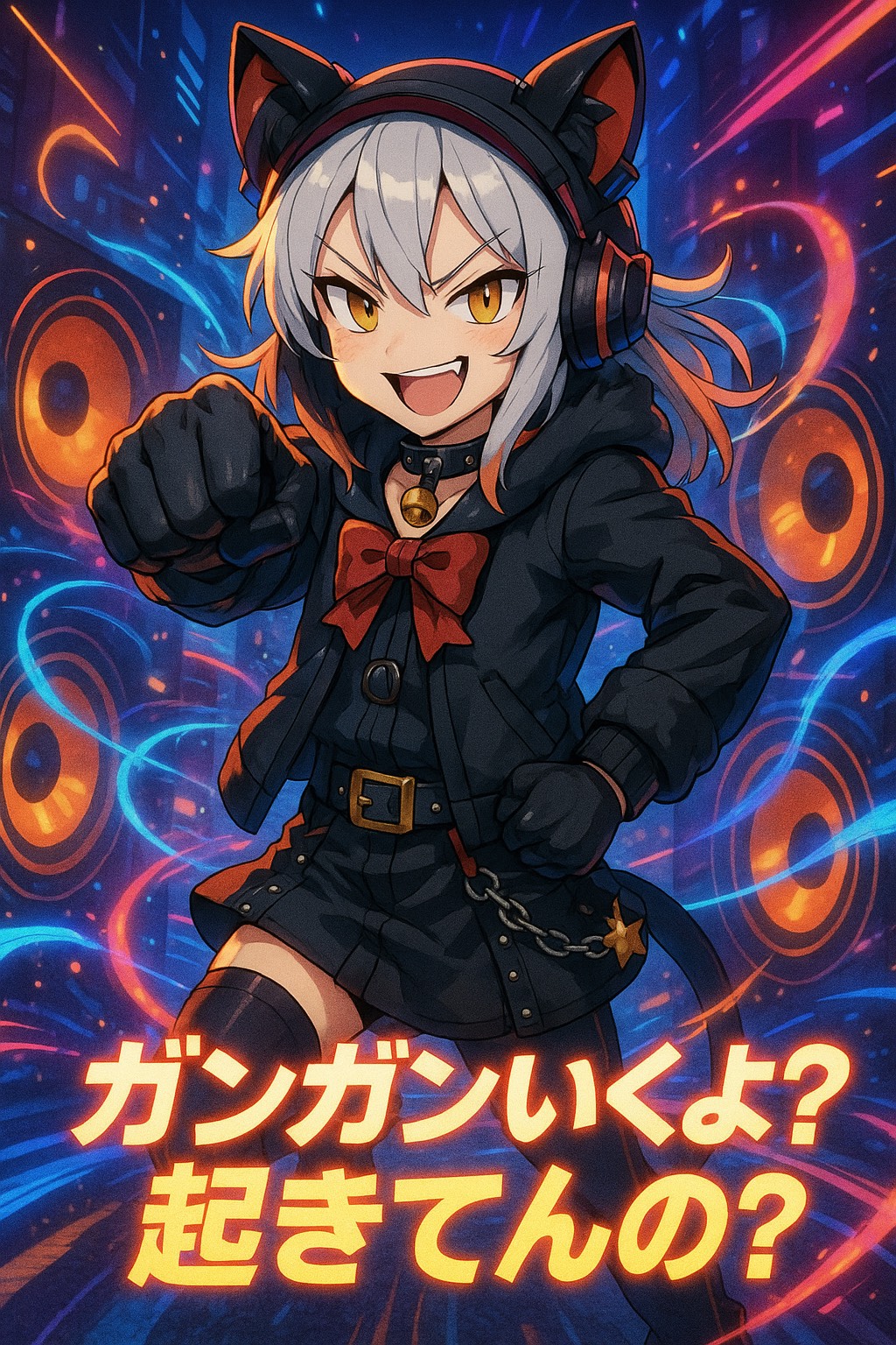 Genre: hardstyle, aggressive EDM, punk, bass house; BPM 155; cute female Japanese vocal with playful but intense delivery; heavy distorted bass, growl effects, sidechained synths, and sharp kicks; rhythmic glitchy verses and explosive drops with shouted hooks and call-and-response phrases; energetic and provocative mood, designed to jolt the listener awake; solo vocal only, no harmony vocals; avoid robotic effects, preserve vocal clarity and impact