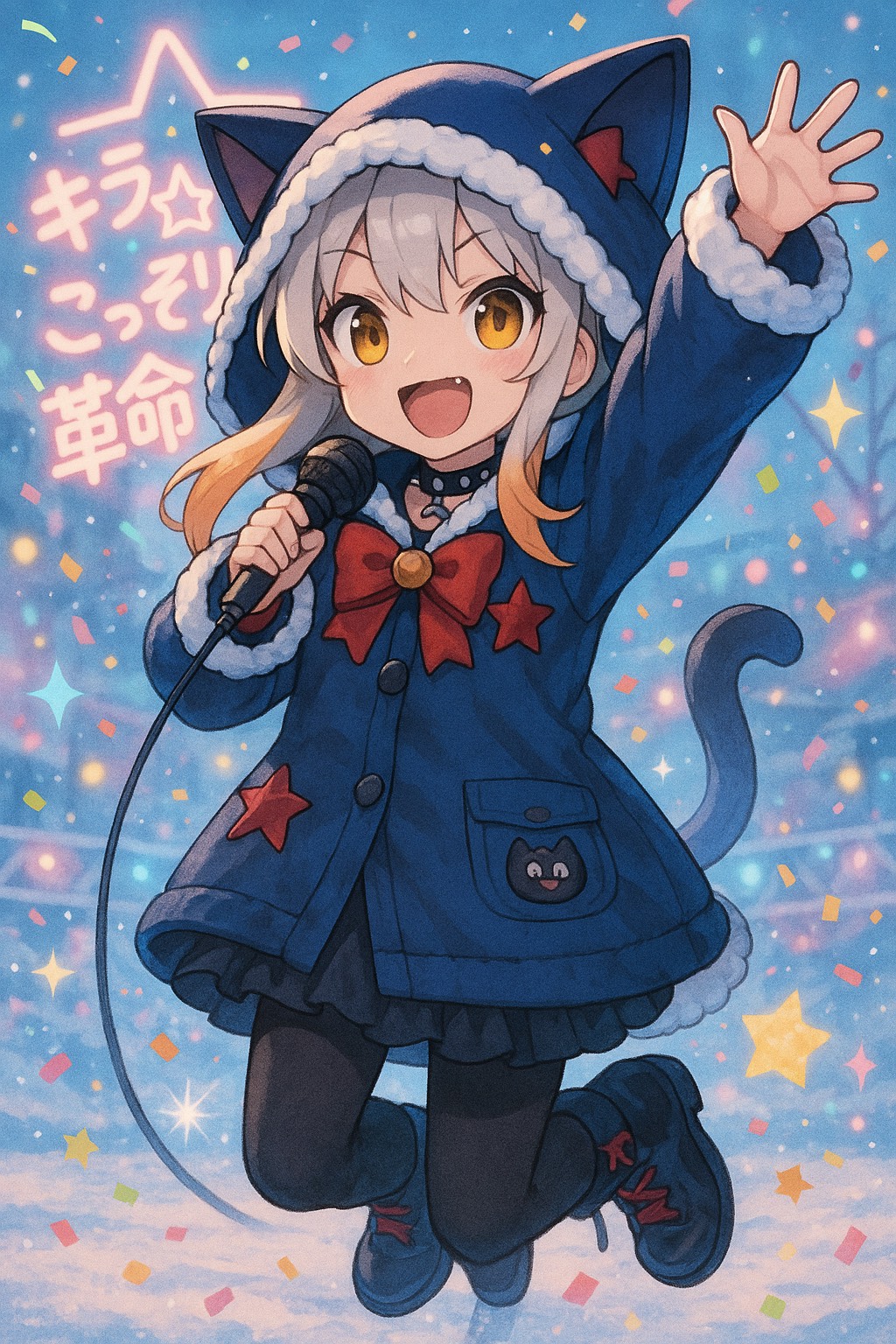 J-pop idol song, upbeat and cute, BPM 160, energetic female vocal, bright synths, catchy chorus, pop-rock band sound, chiptune accents, Japanese lyrics, cheerful mood, sparkly effects, playful rhythm