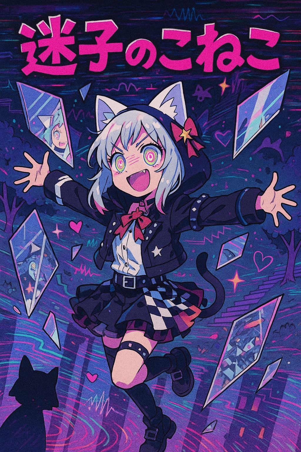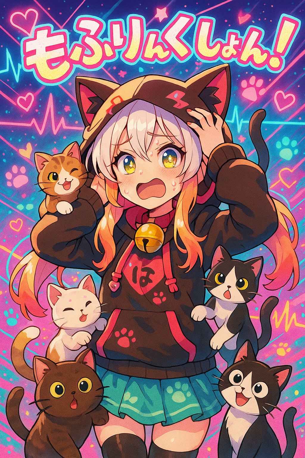 techno pop, denpa song, BPM 155, cute female Japanese vocal, no harmony vocals, playful and chaotic mood, high-pitched and expressive vocals, not robotic, more natural and sweet tone, glitchy synths, punchy drums, electronic meows, lyrics about being overwhelmed by cute cats, anime-style hyper energy, sound should feel like a fun kawaii rave with real voice charm