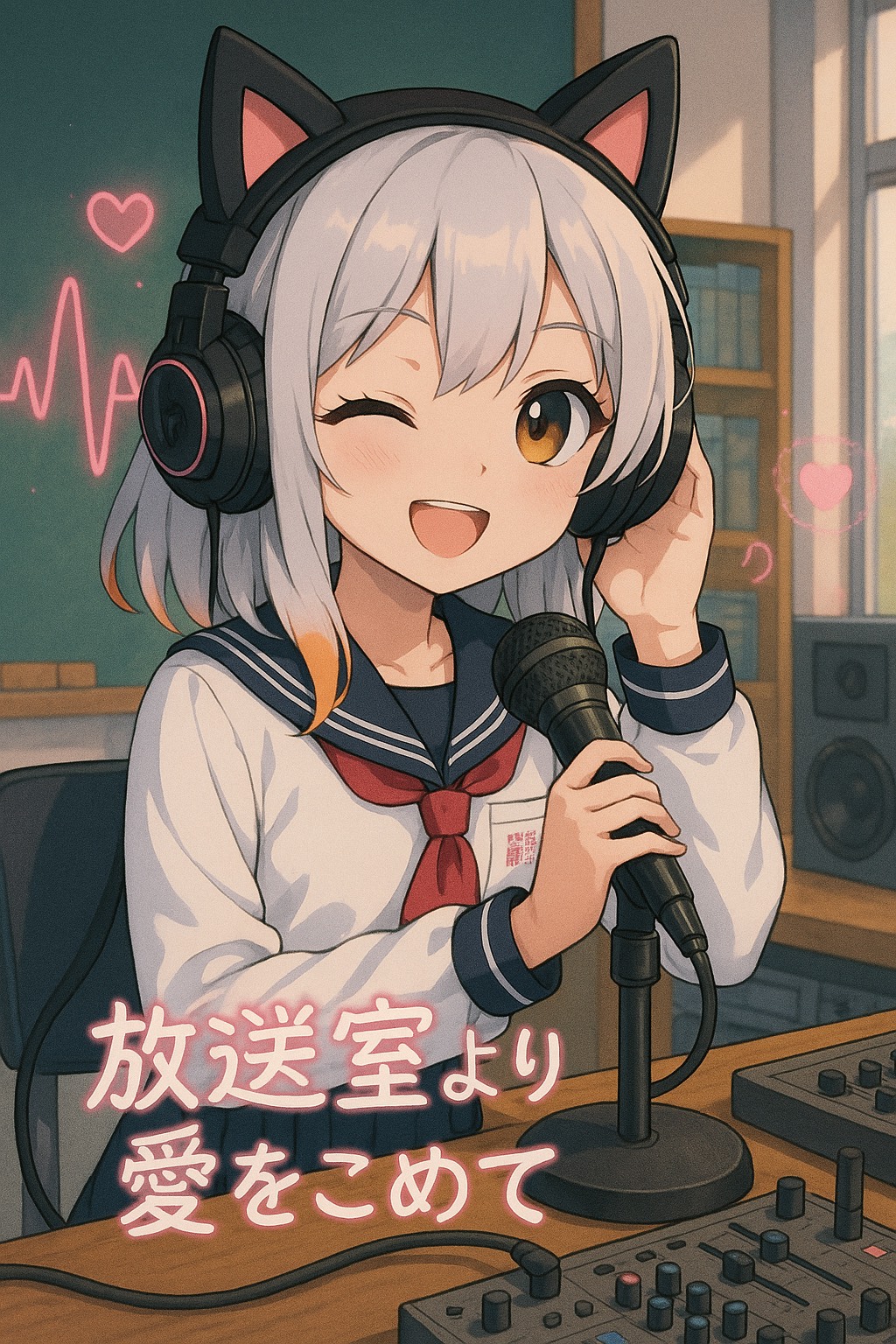 Upbeat kawaii techno-pop track featuring a single cute Japanese female vocal, Includes sparkly chiptune melodies, lo-fi textures, and four-on-the-floor electronic beats, Use playful synths, paging tones, glitchy transitions, and nostalgic school-themed sound effects like chimes and static to create a lighthearted broadcast-inspired atmosphere, Vocals should be bright, expressive, and rhythmically precise, blending melodic singing with occasional pop-style interjections, Avoid spoken dialogue, multiple lead voices, or layered vocals, Keep the vocal performance focused, consistent, and energetic, The overall sound should feel like a digital school broadcast turned into a mischievous, adorable pop concert