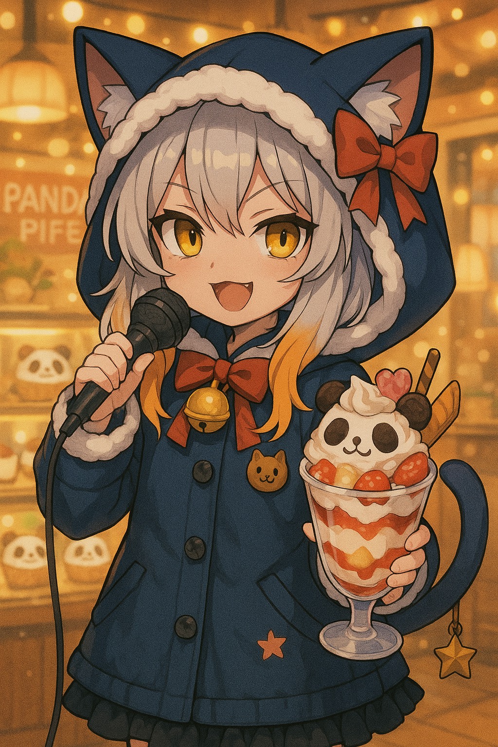 Cute J-pop jingle, bright female vocal, sweet and playful mood, BPM 115, glockenspiel and soft piano, Japanese lyrics, parfait and panda theme, whimsical melody, warm reverb, kids TV commercial style