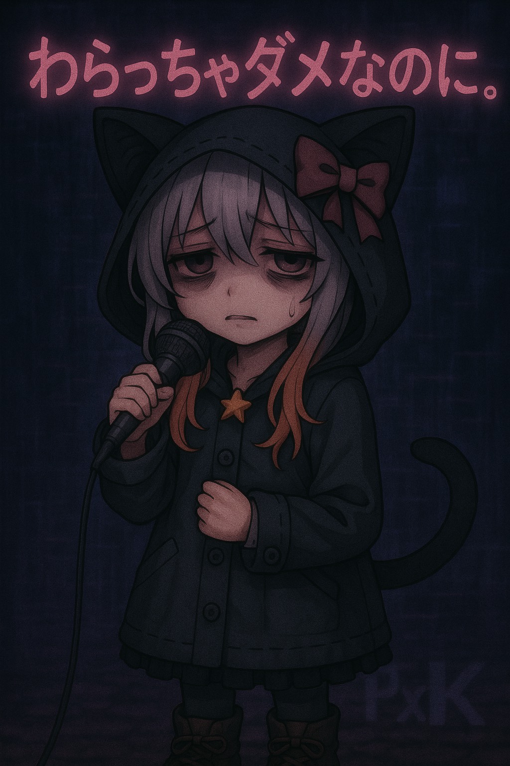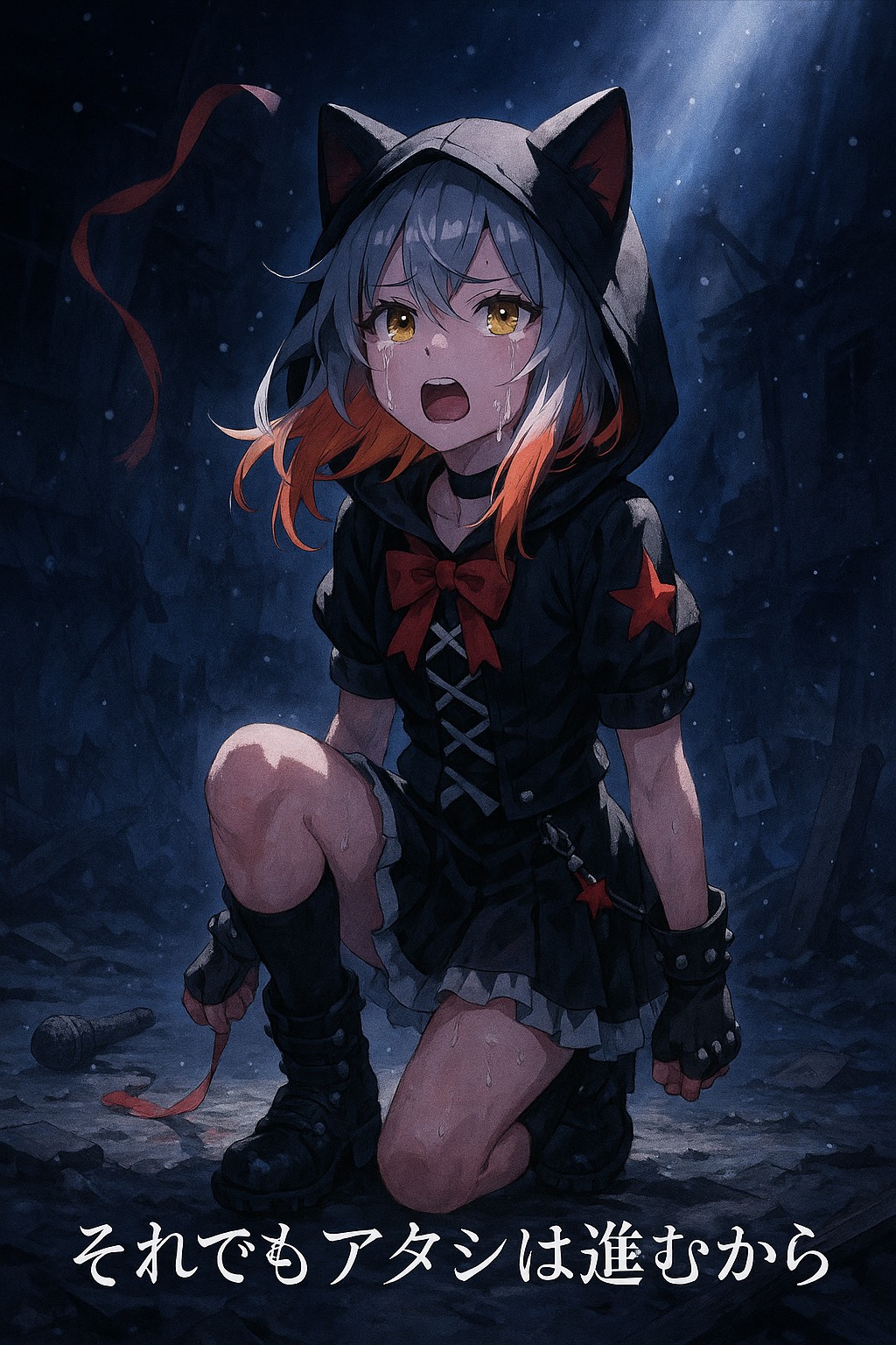 Yamikawaii dark pop, idol rock, emotional female vocal, bittersweet melody, distorted guitar, glitchy synths, bpm 140, Japanese lyrics, cute but sad, dramatic chorus, soft piano intro