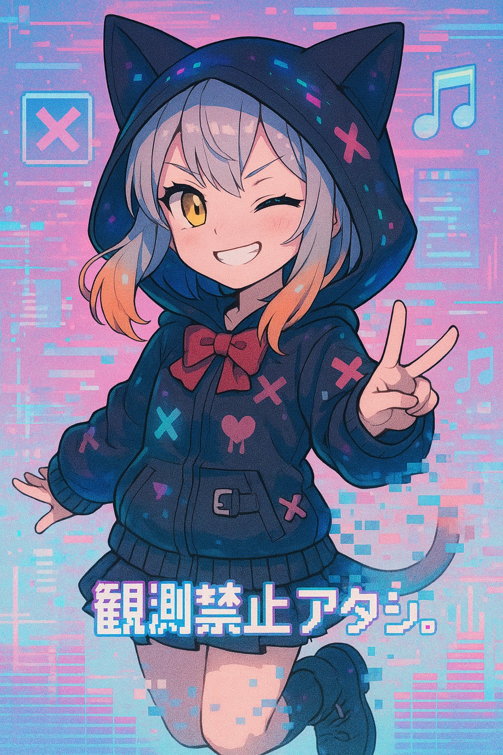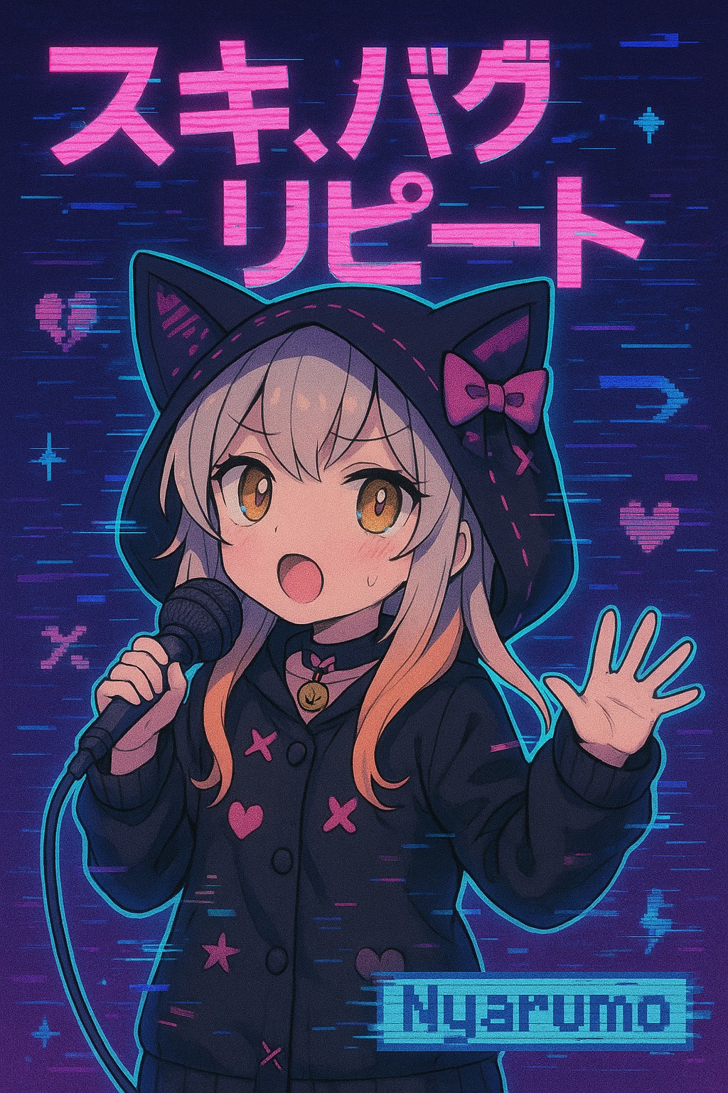 Techno-pop, cute female vocal, glitchy synths, vocoder effects, catchy loops, BPM 132, electronic chiptune elements, Japanese lyrics, digital love theme, playful yet slightly broken, pop-electronica