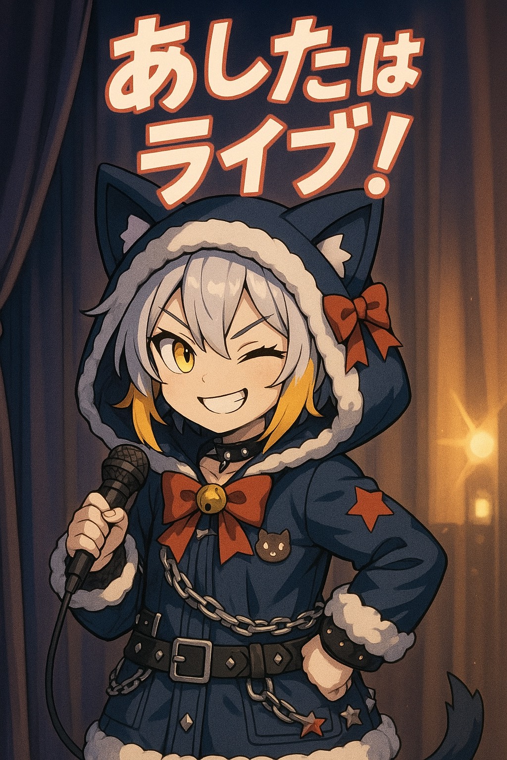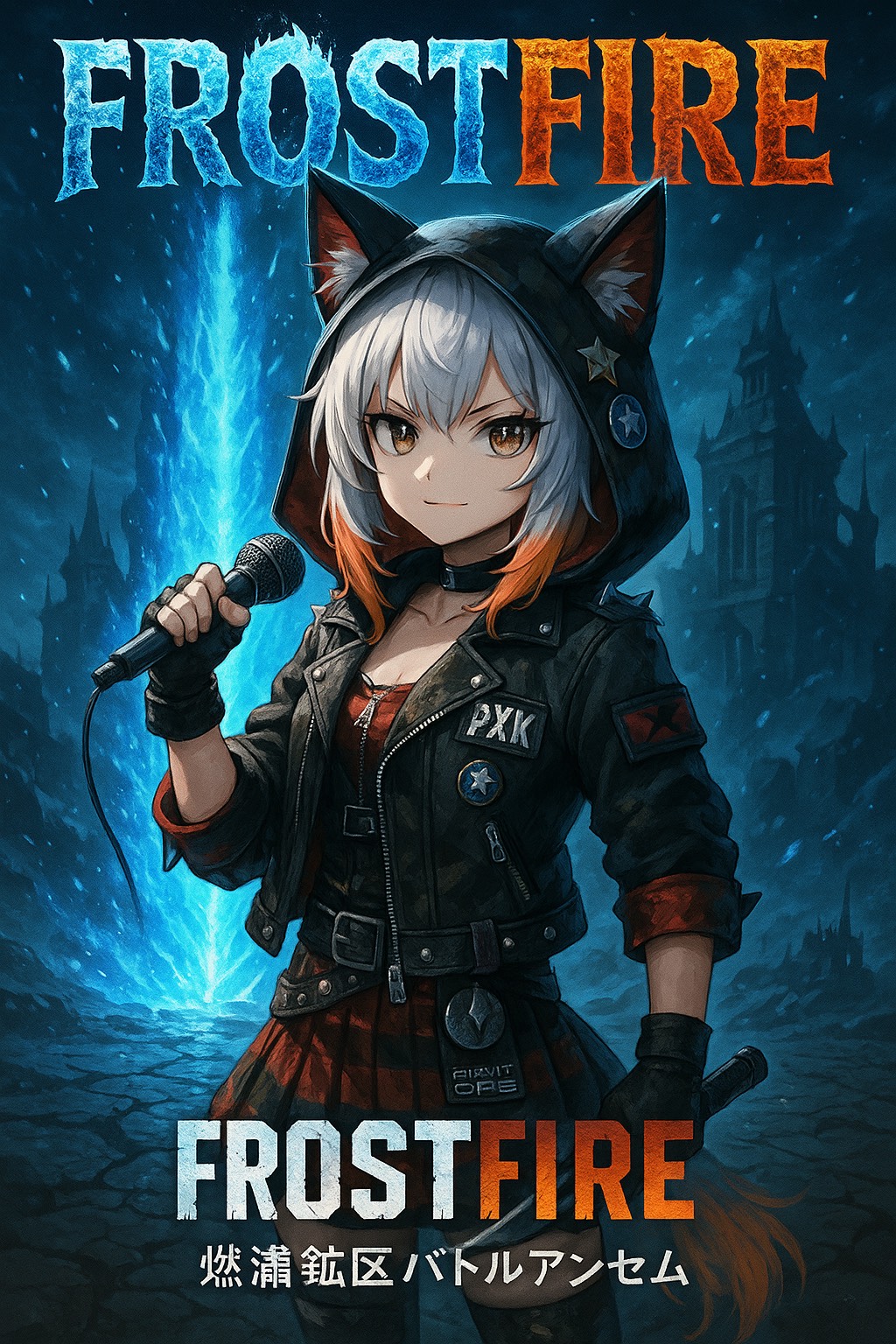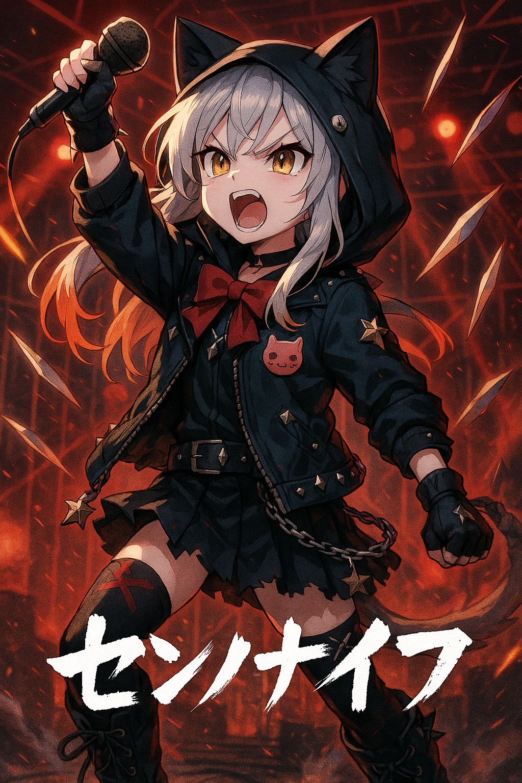 High-speed punk metal (BPM 190–200) with explosive energy and sharp aggression, Emphasize a punchy, prominent kick drum that drives the rhythm like a rapid heartbeat, Features intense Japanese female vocals alternating between rapid-fire lines and emotional scream-shouts, Snare hits should be dry and tight, while bass and kick drums hit hard and forward in the mix, Guitars are gritty and relentless, supporting a rebellious and cathartic mood, Avoid harmony vocals, The atmosphere is chaotic and defiant—like an idol launching 1000 sonic blades with every beat