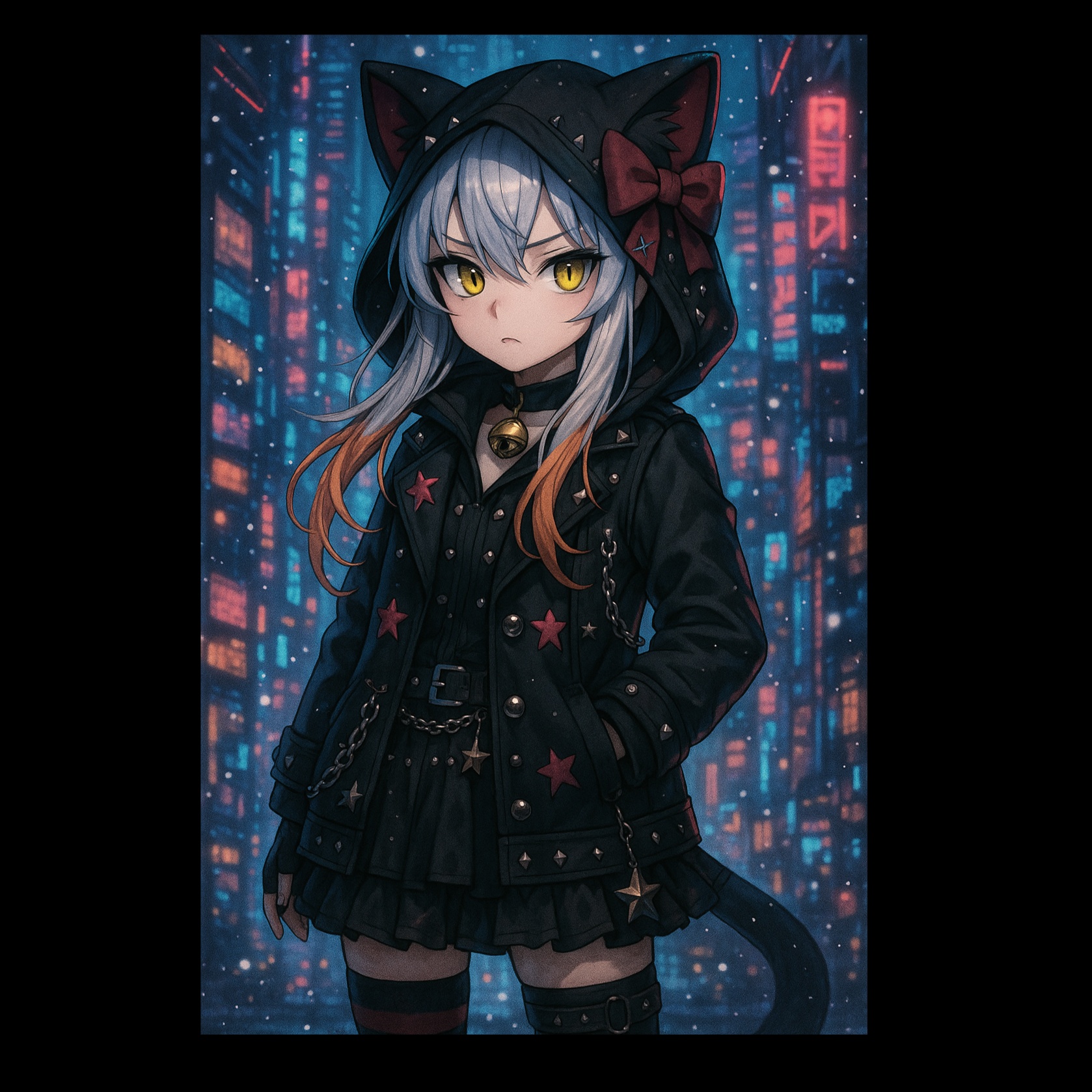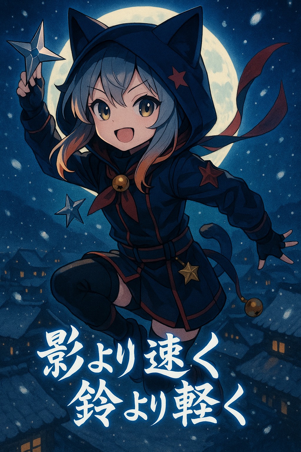Fast-paced Japanese rock track blending traditional Japanese instruments like taiko drums, shinobue flute, and shamisen with energetic modern rock elements, Features a single cute Japanese female vocal with a soft, playful tone, The voice should feel light, mischievous, and slightly teasing—like a catlike ninja idol stealing hearts, Keep the vocals rhythmically sharp but melodically charming, with gentle inflections and lively delivery, Avoid multiple lead vocals or layered harmonies, Melodies should use Japanese pentatonic scales with syncopated rhythms, The mood should be fun, mysterious, and energetic—like a stealthy ninja dancing through moonlit rooftops