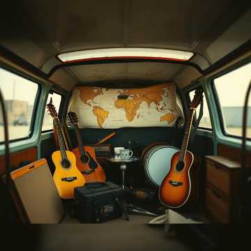 This live stage jam fuses jazz chord progressions with trap beats, syncopated slap guitar rhythms, and bursts of experimental flamenco strumming, The math rock influence brings rapid shifting time signatures and intricate polyrhythms, while multiple guitar layers create cascades of harmonics throughout