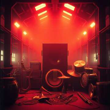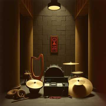 rock with massive repetitive bass and drums, inspired by early Swans, Minimal chord movement, hypnotic looping structure, and crushing low-end, Harsh metallic heavy distorted guitar textures, primitive pounding drums, and a bleak, confrontational atmosphere, Vocals are deep bass-baritone without a high range, monotone, and commanding—half spoken, half sung, The mix feels claustrophobic and physical, like being trapped inside a factory machine, Dark, nihilistic mood with relentless repetition and slow dynamic escalation, Include lyre, harp, frame drum, hand drum, ram's horn trumpet, bronze cymbals, and reed flute