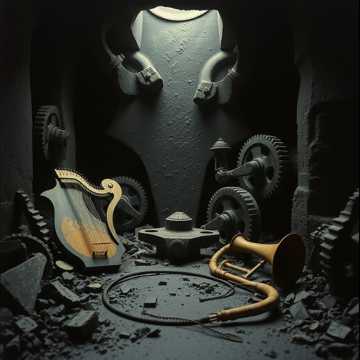 dark heavy rock with massive repetitive bass and drums, inspired by early Swans, Minimal chord movement, hypnotic looping structure, and crushing low-end, Harsh metallic heavy distorted guitar textures, primitive pounding drums, and a bleak, confrontational atmosphere, Vocals are deep bass-baritone without a high range, monotone, and commanding—half spoken, half sung, The mix feels claustrophobic and physical, like being trapped inside a factory machine, Dark, nihilistic mood with relentless repetition and slow dynamic escalation, Include lyre, harp, frame drum, hand drum, ram's horn trumpet, bronze cymbals, reed flute and extra heavy distorted guitar