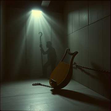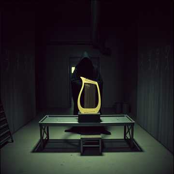 heavy rock with massive repetitive bass and drums, inspired by early Swans, Minimal chord movement, hypnotic looping structure, and crushing low-end, Harsh metallic heavy distorted guitar textures, primitive pounding drums, and a bleak, confrontational atmosphere, Vocals are deep bass-baritone without a high range, monotone, and commanding—half spoken, half sung, The mix feels claustrophobic and physical, like being trapped inside a factory machine, Dark, nihilistic mood with relentless repetition and slow dynamic escalation, Include lyre, harp, frame drum, hand drum, ram's horn trumpet, bronze cymbals, and reed flute