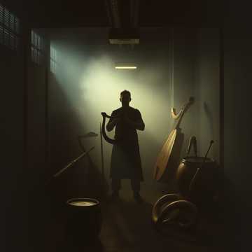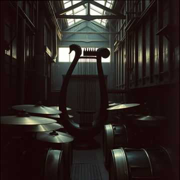 eclectic rock with massive repetitive bass and drums, inspired by early Swans, Minimal chord movement, hypnotic looping structure, and crushing low-end, Harsh metallic heavy distorted guitar textures, primitive pounding drums, and a bleak, confrontational atmosphere, Vocals are deep bass-baritone without a high range, monotone, and commanding—half spoken, half sung, The mix feels claustrophobic and physical, like being trapped inside a factory machine, Dark, nihilistic mood with relentless repetition and slow dynamic escalation, Include lyre, harp, frame drum, hand drum, ram's horn trumpet, bronze cymbals, and reed flute