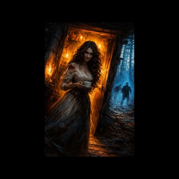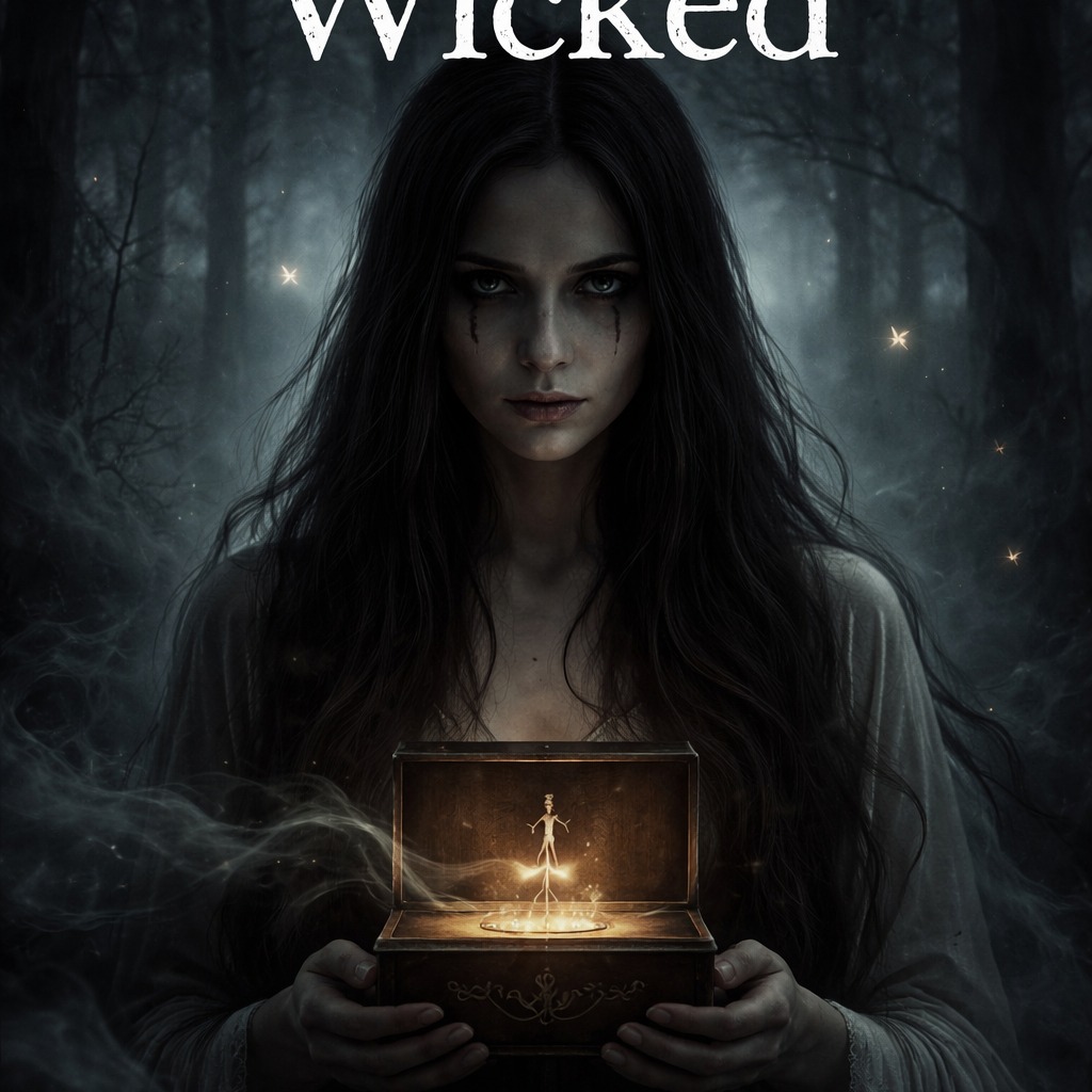 Dark folk horror, witch-house industrial hybrid, female lead vocal shifting from intimate fairy-tale whisper to ancient ritual authority to manic predatory ecstasy to dead-calm spoken intimacy, music box intro, fingerpicked acoustic guitar, low cello drone, ritual hand percussion, heartbeat bass pulse building through verses, sudden industrial trap break with distorted 808s and metallic percussion in hunt section, psychotic laughter layered as rhythmic chop element, floorboard creaks in outro, whispered spoken final section, haunted cinematic mix with wide contrast between delicate and crushing, ‑Campy Halloween sounds, ‑comedy tone, ‑cheesy monster voice, ‑bright pop production, ‑male lead vocal, ‑triumphant rock energy, ‑clean radio-pop drums, ‑synthetic choir, ‑upbeat energy, ‑happy resolution
