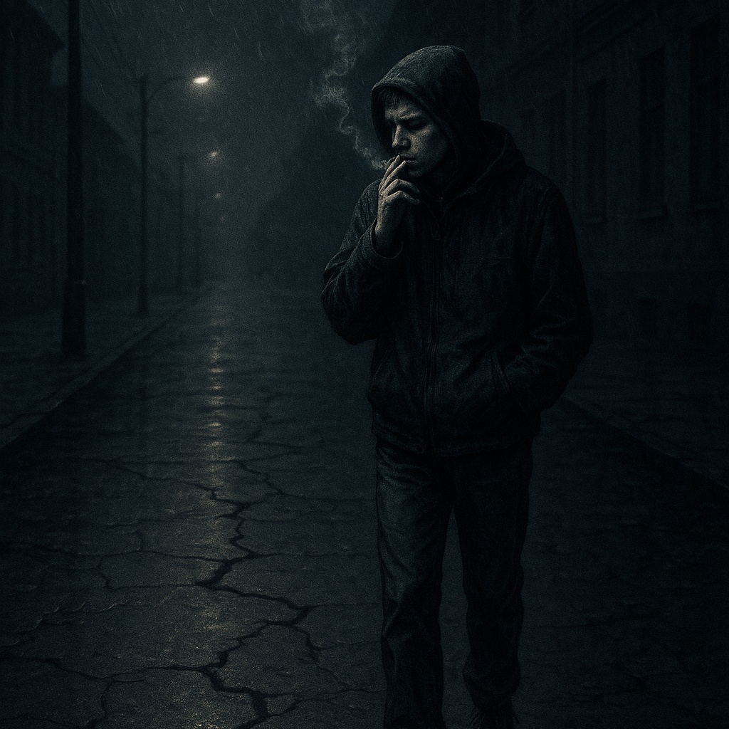 Gritty Russian street rap at 85 BPM with a raw, rhythmic flow and a strong urban groove, Raspy, slightly hoarse male voice, no autotune, spitting verses like late-night conversations in smoky kitchens, every pause hitting as hard as the beat, Punchy kicks, dusty snares, deep warm bass with light overdrive, vintage drum machine groove, muted Rhodes chords, occasional sharp guitar plucks with reverb, Background filled with city ambience, distant traffic, faint police sirens, rain tapping on metal, Production has warm cassette-deck grit, subtle vinyl crackle, vocals pushed forward with the beat laid back, creating that signature nostalgic street vibe — honest, grounded, and real, as if recorded in one raw take straight from the heart of the block