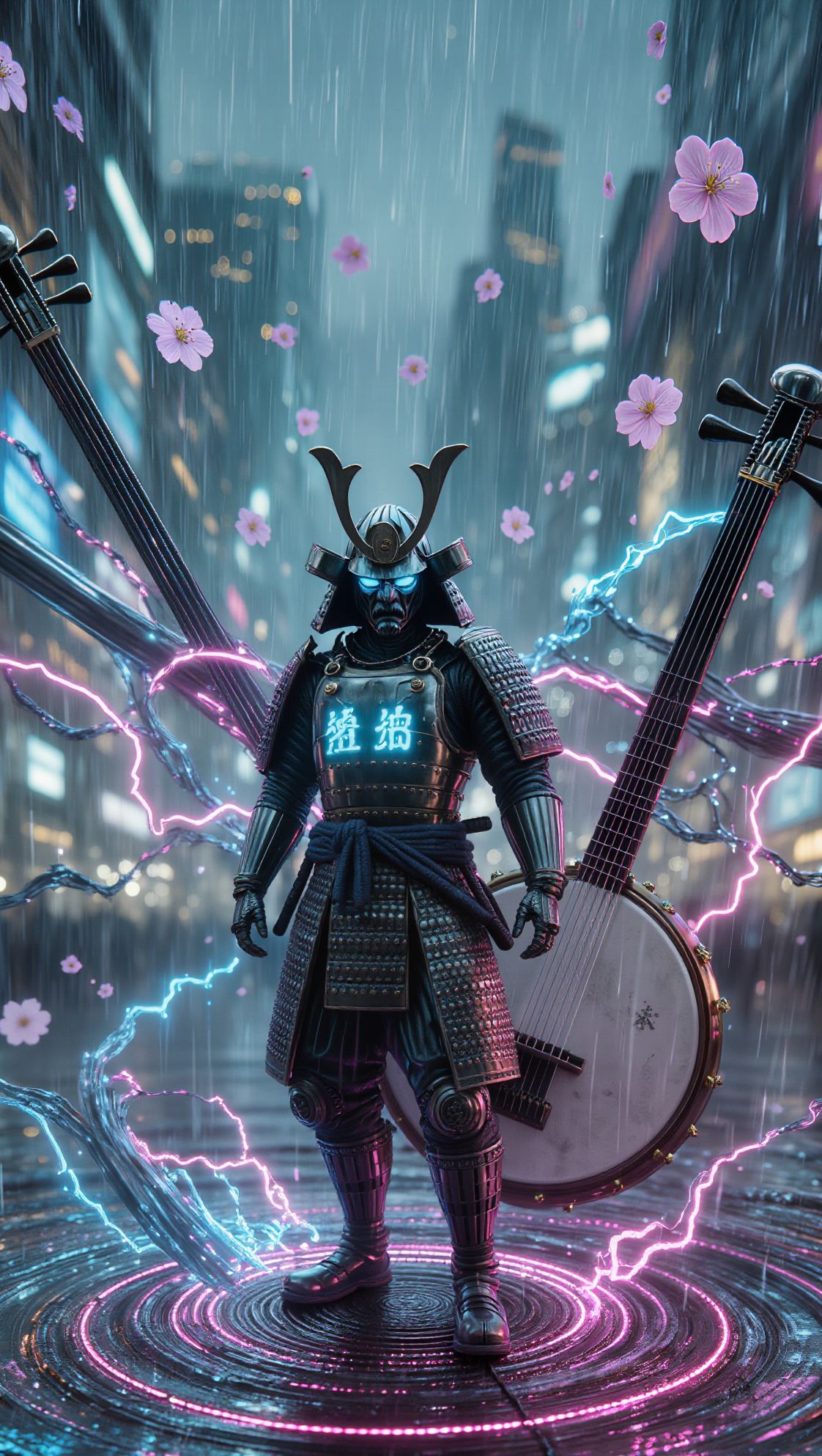 βShamisen distorto, taiko futuristici e synth neon su DnB veloce e bassi liquidi, Marziale, highβtech, cinematicβoriental, β