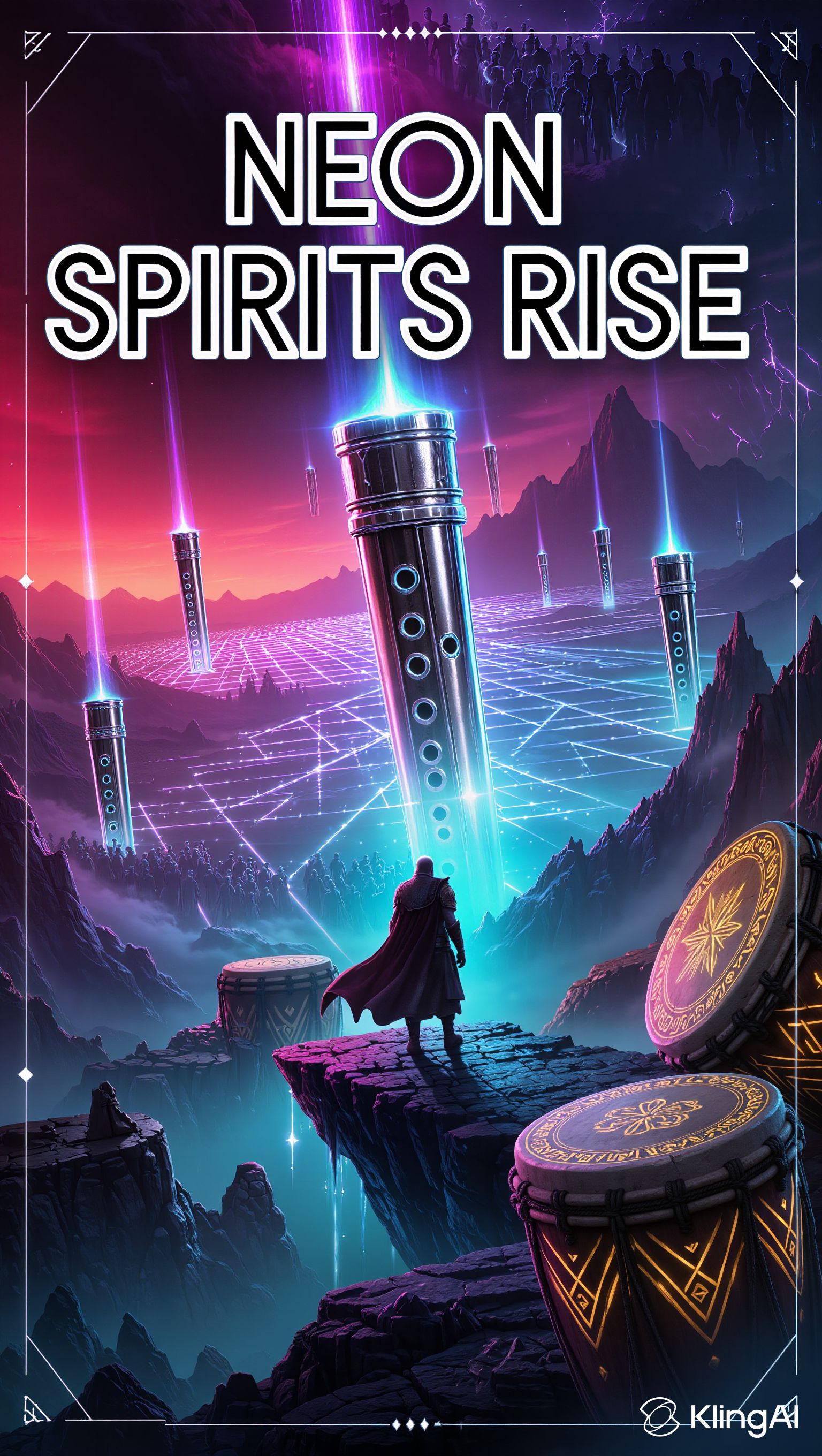 βCornamuse epiche su synthwave neon, bassi analogici e atmosfera eroica, Retroβepic, luminoso, unico, βTrance + Native American Drums