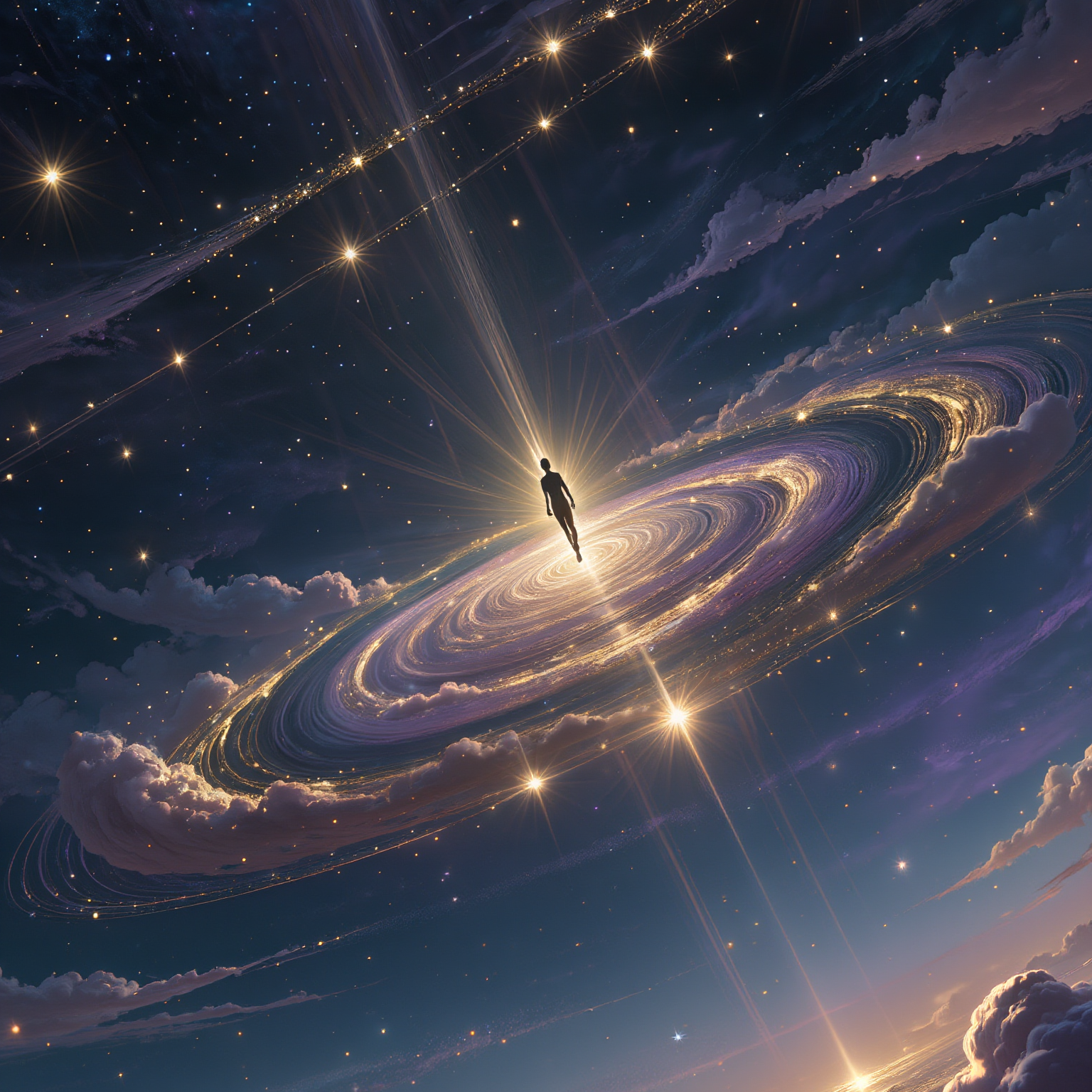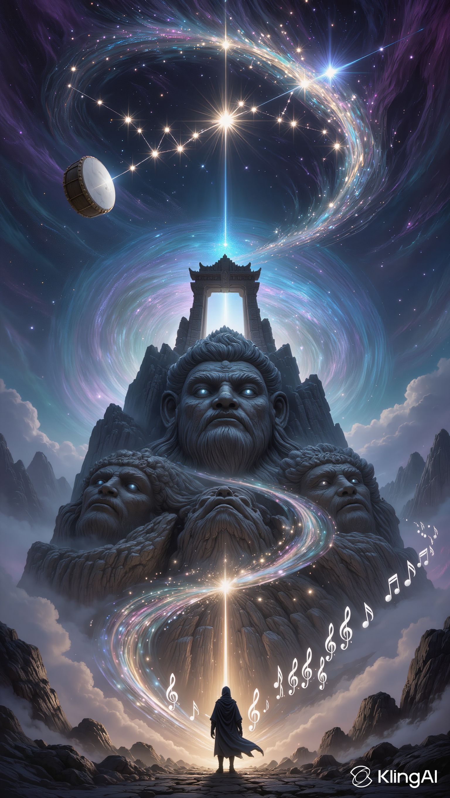 Mythic cinematic with massive drums, deep choirs, and the overwhelming presence of ancient gods, Mythic cosmic theme with shimmering textures and interdimensional resonance