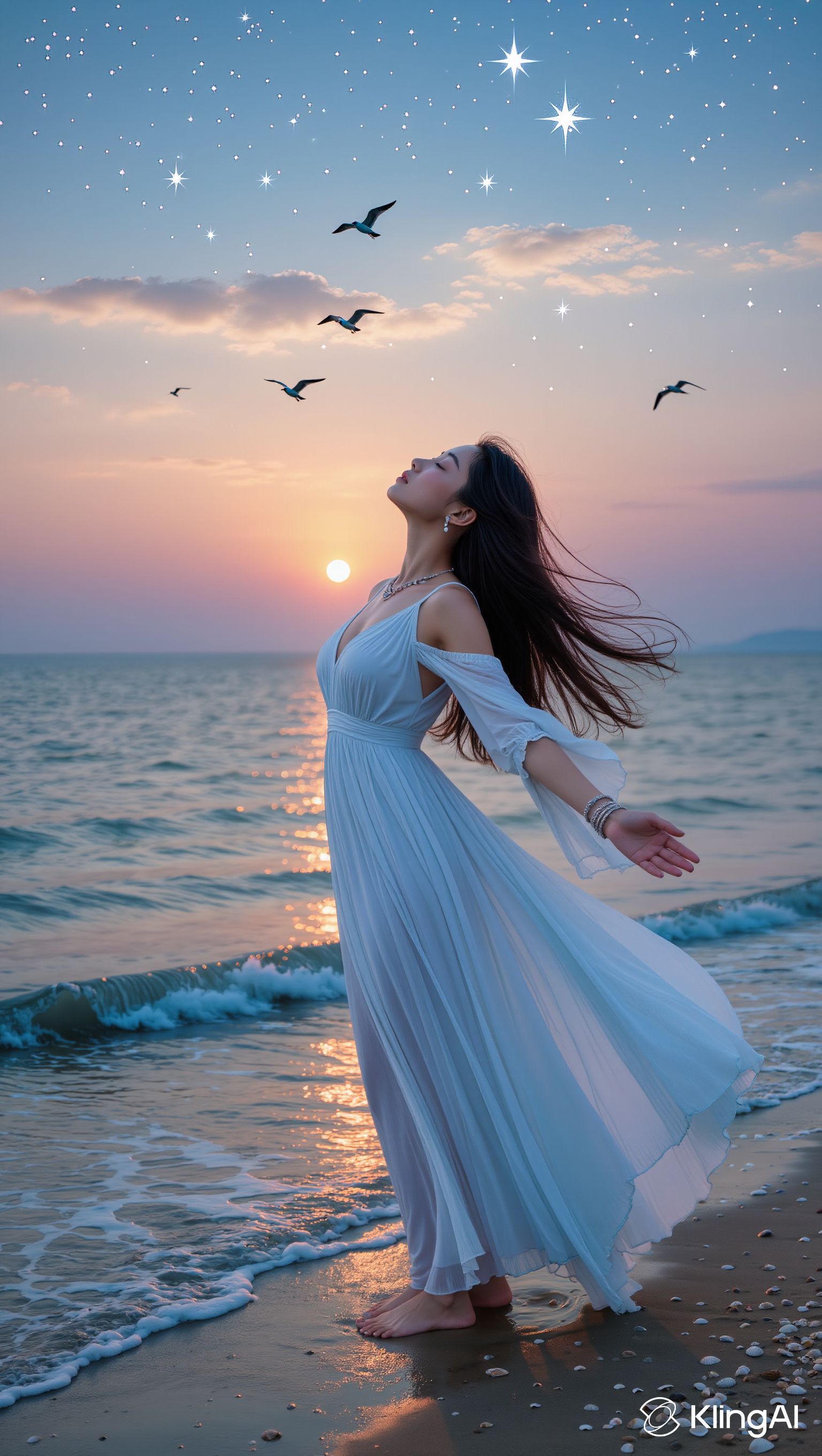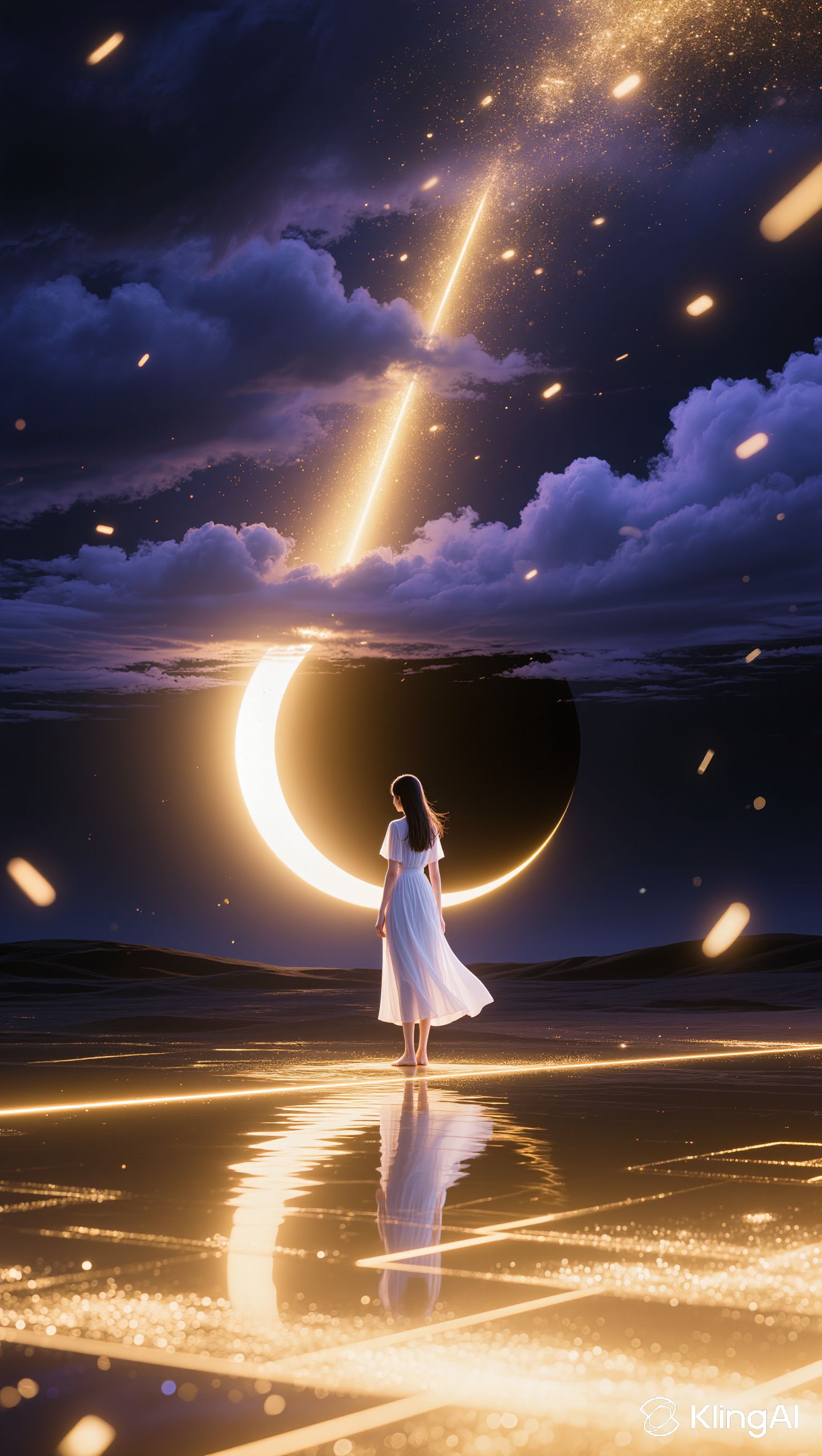Ethereal synth-pop track featuring a blend of cinematic soundscapes and electronic dance elements, The arrangement is built on lush, atmospheric pads and shimmering digital textures that create a sense of vastness, A driving, syncopated electronic drum beat enters with a crisp snare and deep kick, maintaining a steady mid-tempo pace, The lead vocals are female, characterized by a breathy, emotive delivery with significant reverb and delay effects to enhance the dreamlike quality, Harmonized vocal layers provide a rich, choral texture during the expansive choruses, The harmonic structure utilizes minor-key progressions with suspended chords to evoke a sense of mystery and longing, Production features include side-chain compression on the synths, sweeping filter sweeps, and a clean, wide stereo mix that emphasizes the immersive, futuristic aesthetic