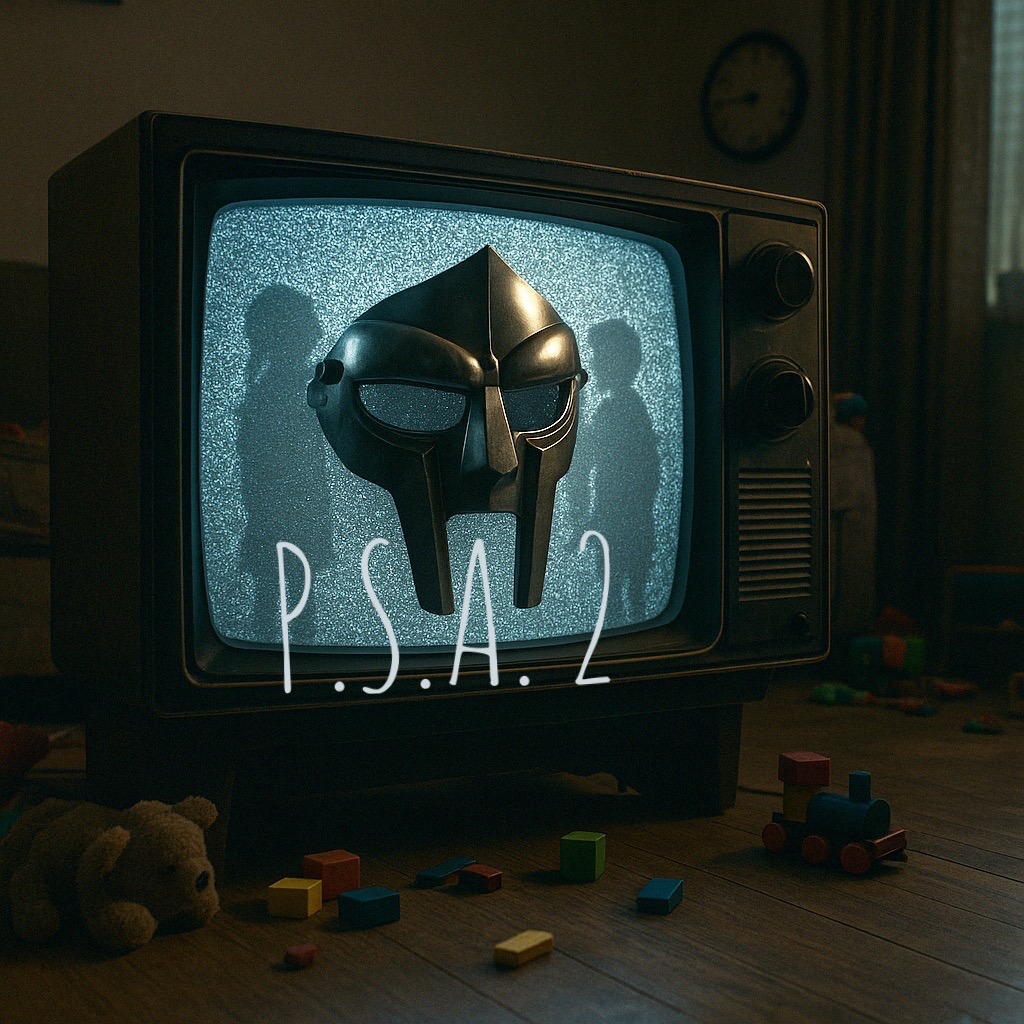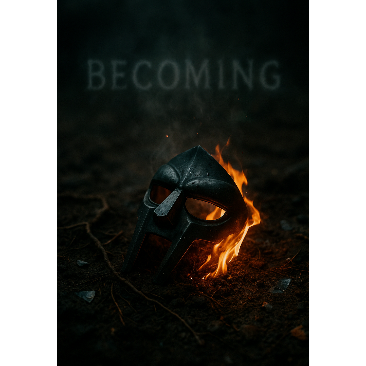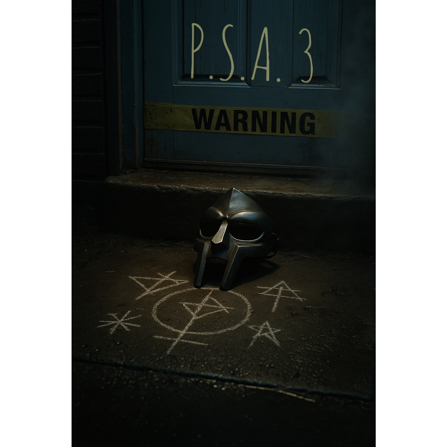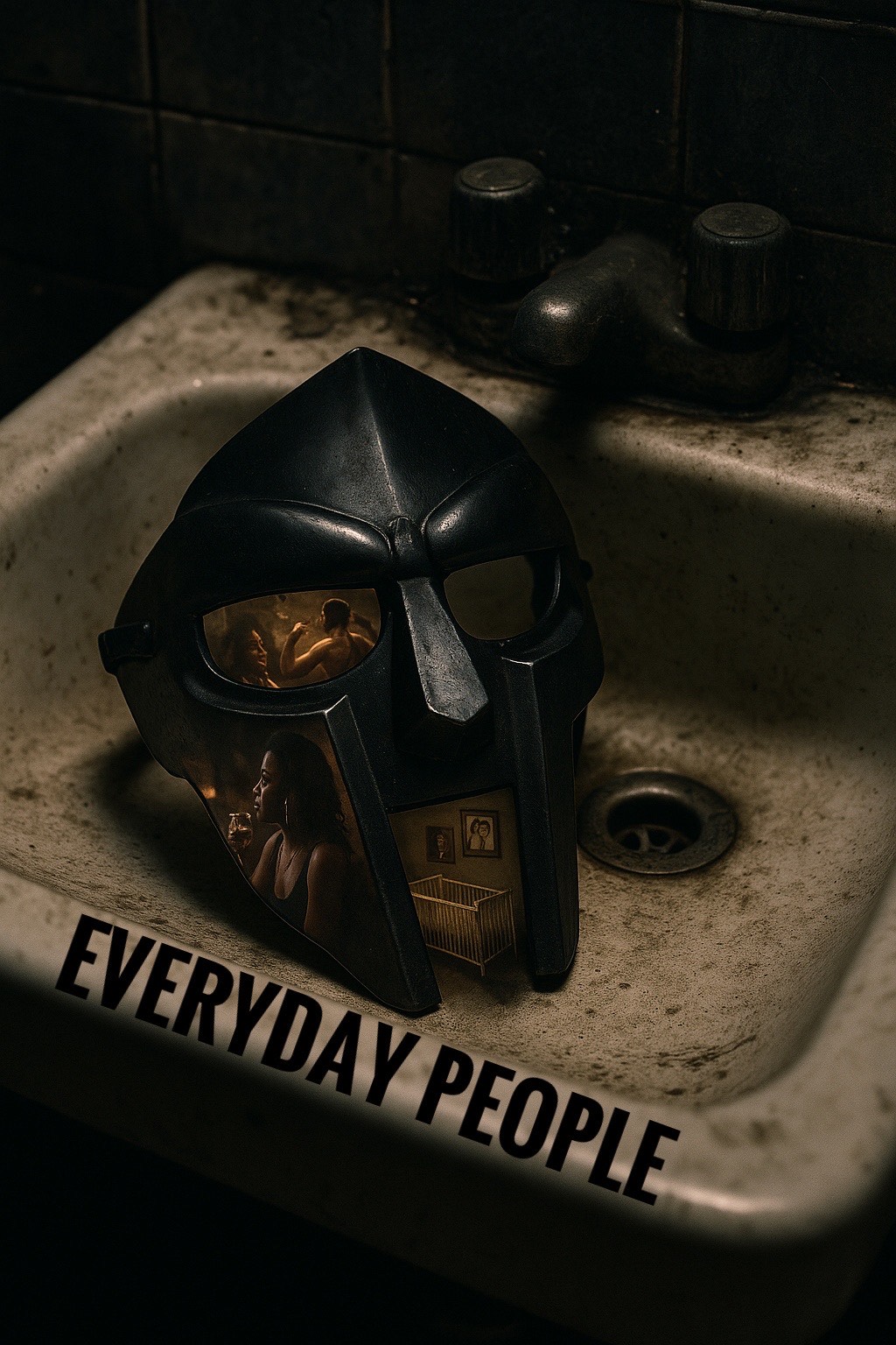 Underground hip-hop with gritty, lo-fi production inspired by Madlib’s beats on MF DOOM’s “Madvillainy” album, Raw vinyl textures, jazz and soul samples, unpredictable drum loops, and experimental arrangements, Male rapper with a deep voice, masked MF DOOM-style flow—dense multisyllabic rhymes, comic book references, offbeat cadence, and clever wordplay, DJ scratches on the chorus using a sampled male vocal, Abstract, cinematic, and dusty