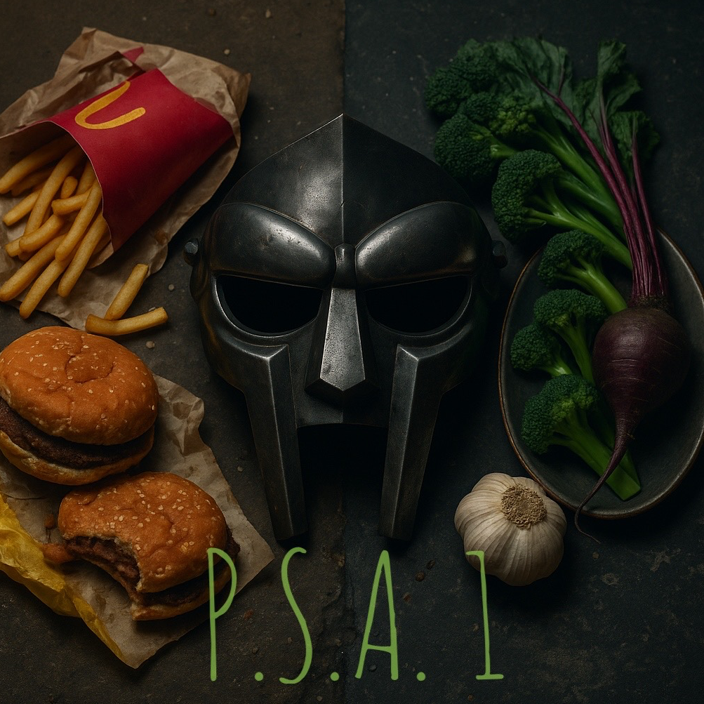 Upbeat MF DOOM-style hip-hop with dense internal rhymes, clever similes, food metaphors, alliteration, and villainous wordplay over a gritty Madlib-type beat, DJ scratches throughout, including chopped-up news reporter samples in the intro, chorus, and bridges, Lo-fi, raw, and sample-heavy with cinematic horns, vinyl crackle, and boom bap drums, Include DOOM-style adlibs, sinister laughs, and background food lines, Keep flow off-kilter, lyrically abstract, and cartoonishly dark
