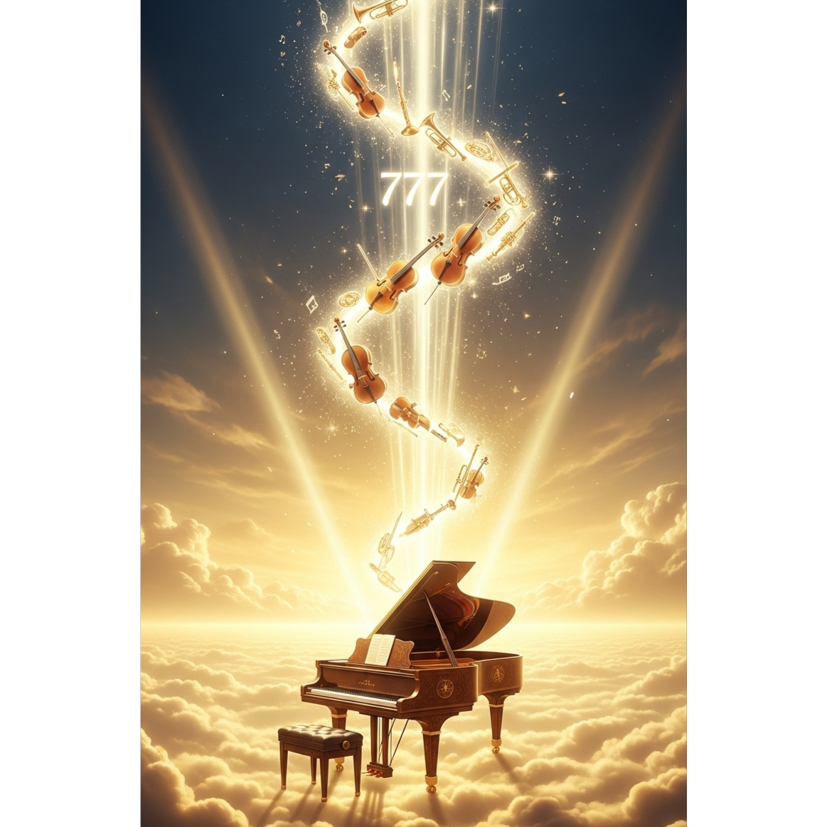 cinematic sacred finale, grand piano soaring melody, soft staccato piano highlights, lush orchestral strings, sacred choir and whispering voices, deep low tom and taiko drums, shimmering pads, celestial bells, Sacred Art influence, Rich Atmosphere, infinite radiant closure