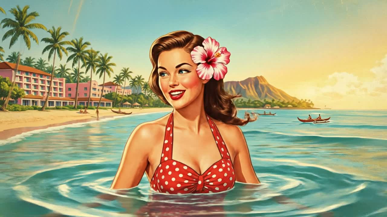 vintage swing, traditional Hawaiian hula, 128 BPM, brushed jazz drums, slack-key guitar harmonics, ukulele tremolo strum, upright bass walk, vibraphone comping, muted trumpet riffs, steel guitar glides, syncopated swing groove, cascading call and response, chamber reverb, tape saturation, sparse intro, midtrack breakdown, full-band crescendo, warm analog mix