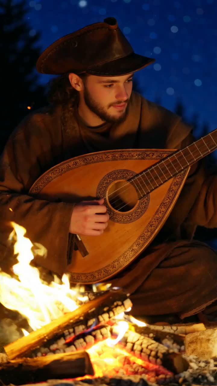 Sparse solo lute interlude, close and intimate, recorded as if by the fire: soft crackle and drifting pops in the stereo field, Slow, aching phrases with long pauses and delicate ornamentation; melody leans into unresolved tones that tug at the heart, Subtle reverb creates a small camp clearing at night, letting each pluck fade into the hush, sad, beautiful, tone