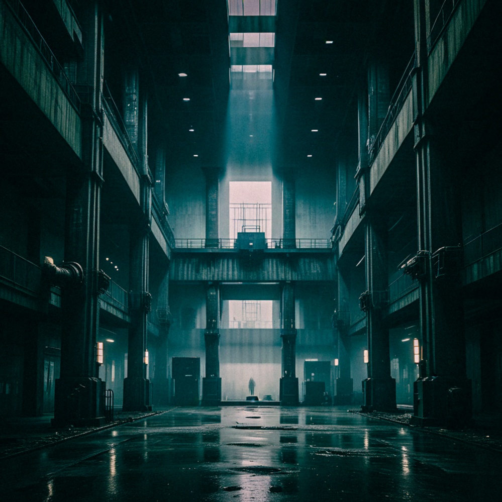 [dark cinematic techno], driving bassline, stark beat, layered pads, mechanical, dramatic, phrygian, sparse lead