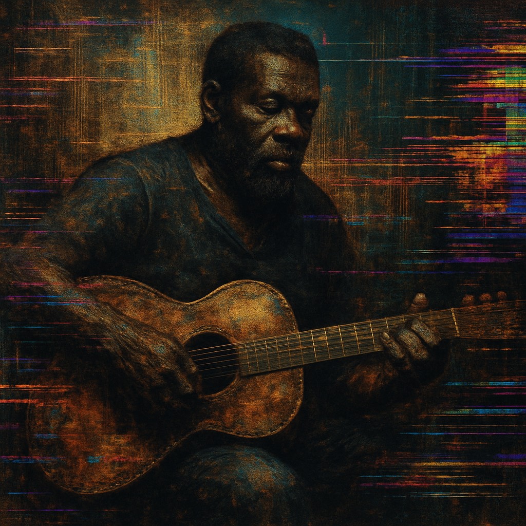 delta blues, chiptune, braindance, lo-fi grit, 8-bit texture, analog decay, glitch blues, raw emotion, melodic distortion, soulful chip grooves, swampy circuits, bluesy arpeggios, crunchy waveforms