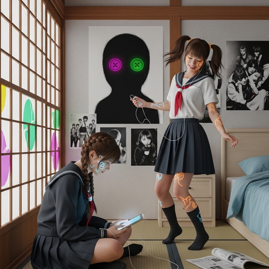 [Style: Lo-fi Hip-Hop, Jazzy Funk, City Pop, with explosive Ska-Industrial-Punk breakdowns, Nujabes/Samurai Champloo chill vibe in verses, emotional Anohana-style J-Pop chorus, FEMALE VOX 1 (A, HARU): J-Pop sweetness exploding into Yakuza-Punk power, FEMALE VOX 2 & 3 (FFKABUTO33): Childlike, ethereal, haunting vocal harmonies, almost like a "baby doll" choir, Jazzy, melancholic piano loops, virtuosic funky bass, driving lo-fi hip-hop drums that transform into aggressive Candombe-Industrial glitch beats, Weeping Bandoneón, soaring strings, soulful Harmonica, Massively viral, bittersweet, danceable, and emotionally devastating, ~95 BPM (verses) shifting to ~160 BPM (breakdown), ]