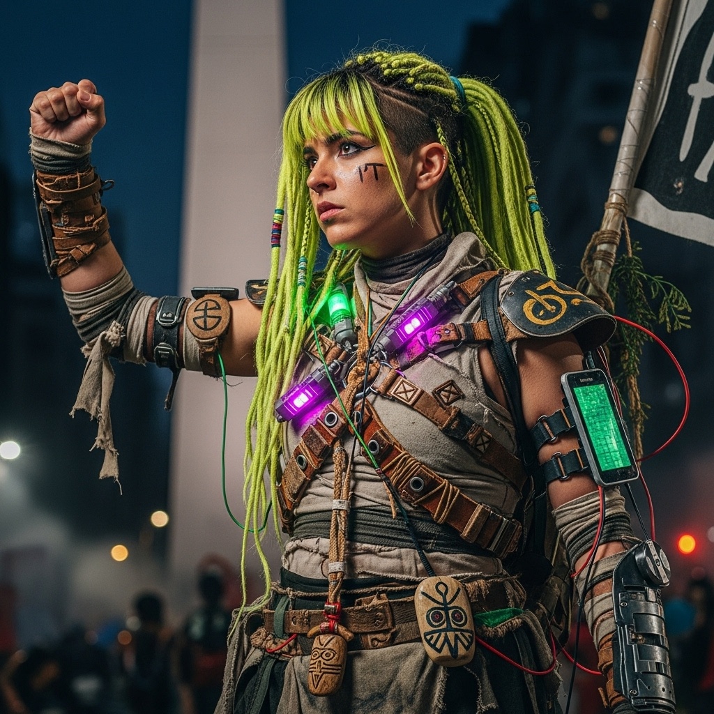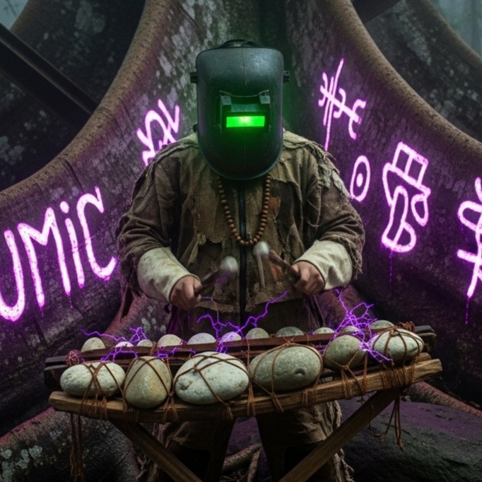 [Music Style: Tribal Glitch-Hop, Hindi Vocals, Uruguayan Murga Choir, Industrial Taiko Percussion, Danceable, Ritualistic, English Hooks, Cyberpunk Candombe]