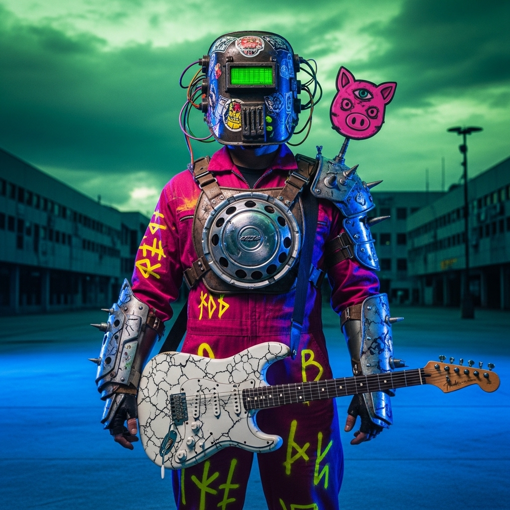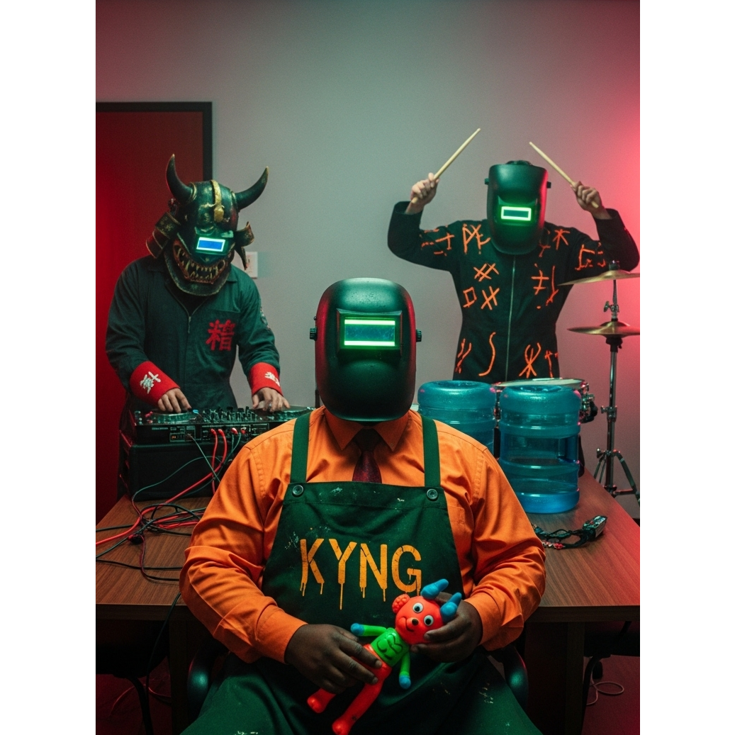 [Music: A fusion of raw funk, rock, and retro-futuristic Asian folk, The absolute star is a blazing-fast, funky, and slightly distorted Shamisen riff that is the core of the song, The beat is a primal, hypnotic groove crafted from Japanese wooden percussion (Hyōshigi, Kachi-kachi) and junk metal, A low, ominous synth drone provides a constant, underlying tension, ]
