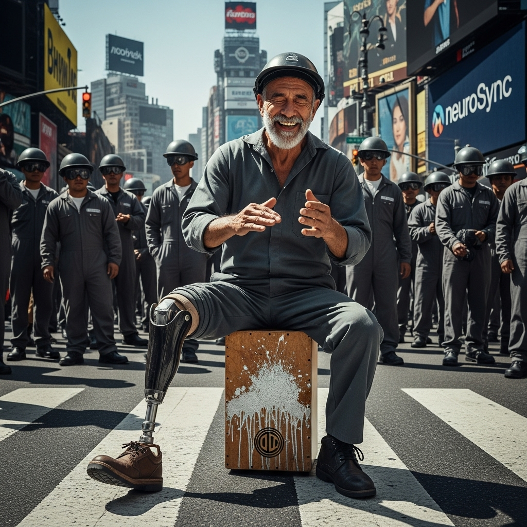 [Music: A raw, infectious "Found-Object Funk" beat, The core groove is a deep Peruvian Cajón (providing bass & digital glitches) and a dirty, unforgettable wah-wah guitar riff, ]