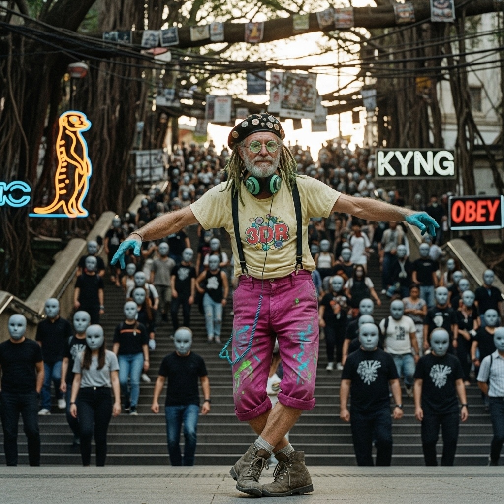 [Style: MALE VOX 1 (smooth soulful Afro-Elven wisdom, charismatic guru); FEMALE VOX (J-Pop Idol sweetness with Yakuza-Punk power & mystical SHAMISEN solos); MALE VOX 2 (cool alt-pop, questioning then confident); REGGAE-FUNK-PUNK ANTHEM (uplifting rebel energy meets psychedelic AFRICAN/MIDDLE EASTERN influences, iconic training montage power & carefree philosophy), SIGNATURE TRIBAL-TECHNO-ELECTRONIC DRUMS (insane Candombe/Industrial/Metal/Hip-Hop/Reggae/Ska-Punk fusion; heavy glitch; VIRTUOSIC HARMONICA BEATBOX; COWBELL/OLD BARRELS/DJEMBE/DUNBEK; unique EDR/XION production power), DEMONICALLY VIRTUOSIC SHAMISEN (funk-punk-ska-oriental-African highlife explosion; extreme technicality), DEEP P-FUNK BASS (legendary groove), WEEPING/RAGING BANDONEÓN, GRITTY DISTORTED GUITAR, SOARING STRINGS, EERIE THEREMIN, Massively viral, unforgettable, brain-breaking, intensely danceable, psychedelic party/training/revelation ANTHEM, ~120-140 BPM (dynamic shifts for training & philosophy)]