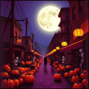 [Atmosphere: a decadent Halloween banquet turned infernal carnival — guests dance with the dead under a blood-orange moon, their laughter melting into madness, ]