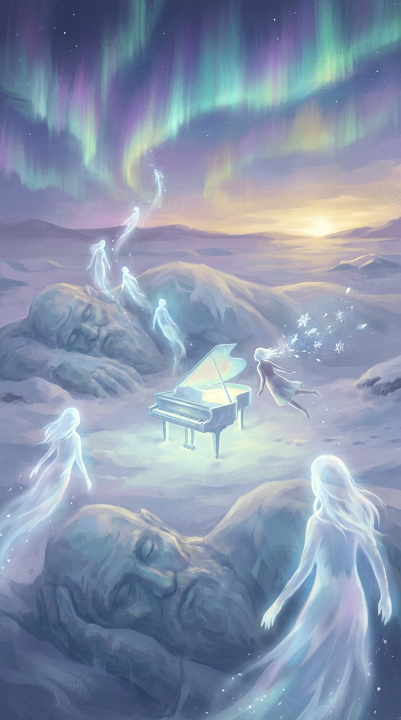 v5 nordic jazz, lo-fi hip hop, 78 BPM, icy ambience, warm vinyl crackle, ECM-style piano, soft brushed drums, airy female vocal or soft male whisper, deep reverb, mythic frost atmosphere, runic textures, distant low drones, minimal phrasing, spacious mix, gentle sax textures, no artist names, no fade, strong final chord, ‑Airy Female