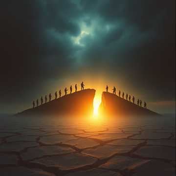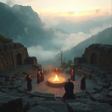 Georgian polyphonic choir performing traditional three-part harmony with deep drone bass (bani), bright dissonant middle voice (mkrivi), and soaring top voice (zili), Raw male vocal timbre, open-throat resonance, ancient Caucasus folk singing, ritual chanting, powerful unison breaks, mountain echo ambience, cinematic reverb, Epic and sacred atmosphere, mountain sunrise, spiritual intensity, slow-building tension, Minimal percussion, subtle panduri drone, ancient folk texture