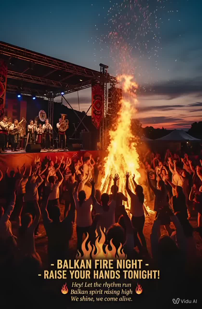 Balkan Brass, fast tempo, energetic brass section, punchy trumpets, deep tuba bassline, lively clarinet, gypsy-style melodies, syncopated Balkan rhythms, upbeat percussion, festival atmosphere, lively crowd energy, modern Balkan fusion, bright horns, cinematic flair