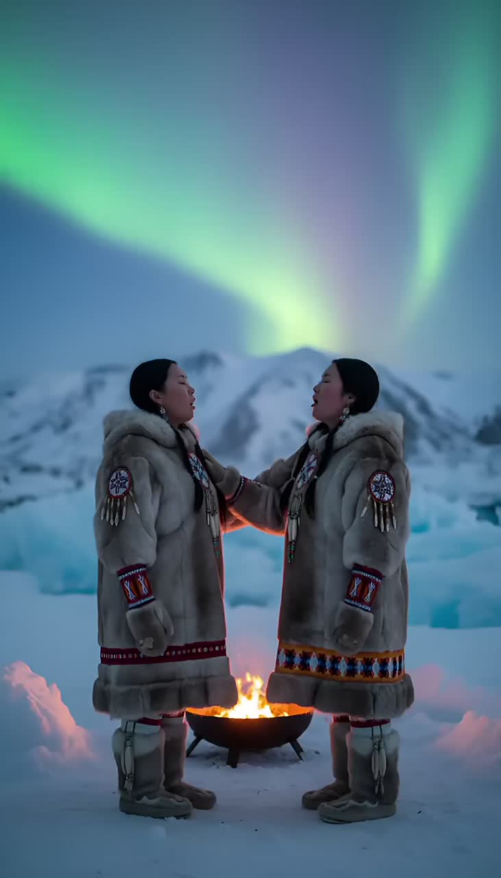 Inuit shamanic throat singing with fast rhythmic breath patterns, harsh deep throat resonance, primal minimal chant structure, dual female call-and-response, trance-inducing repetition, Arctic shaman ritual energy, raw wind ambience, aggressive katajjaq textures, ancient spirit invocation