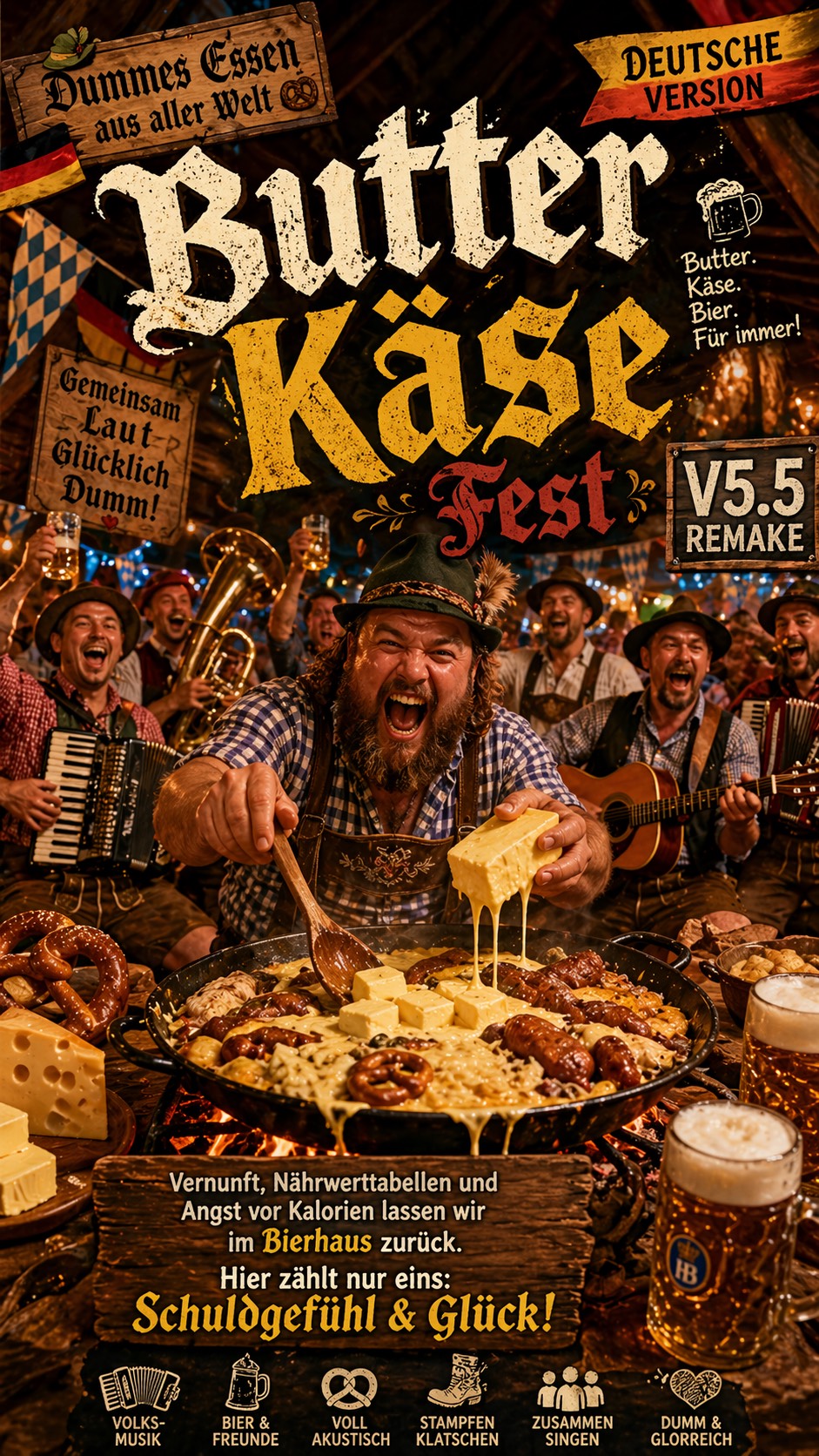 German Beer Hall Campfire Feast Anthem, Oktoberfest Folk Energy, Fully Acoustic, Rowdy, Human, Loud And Communal, Front-And-Center Male Lead Vocal, Close-Miked, Dry, Pushy, Confident, Reckless, Like The Loudest Cook Leading A Beer Hall Table, Not Polished, Elegant, Cute, Or Idol-Like, Accordion, Tuba, Clarinet, Fiddle, Acoustic Guitar, Upright Bass, Frame Drum, Hand Claps, Stomps, Wooden Table Hits, Big Group Shouts, No Synths, No Glossy Pop, No EDM, No Rock, Strong Stomp Pulse, Beer Hall Singalong Energy, Call-And-Response Hooks, Short Repeated Refrains, Rising Crowd Momentum, Verses Feel Like Chaotic Cooking In Motion With Clear Diction, Choruses Are Big Communal Tavern Refrains, But Lead Vocal Stays In Front, Spoken Parts Are Close Outdoor Calls, Final Section Bigger, Warmer, Dumber, More Glorious