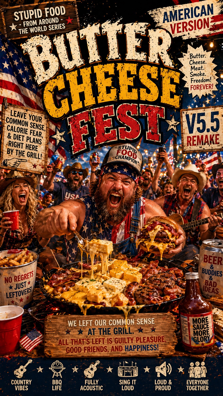American Appalachian Campfire Feast Anthem, Americana Stomp Folk, Fully Acoustic, Rowdy, Human, Loud And Communal, Front-And-Center Male Lead Vocal, Close-Miked, Dry, Pushy, Confident, Reckless, Like The Wildest Cook Leading A Backwoods Campfire Crowd, Not Polished, Elegant, Cute, Or Idol-Like, Banjo, Fiddle, Acoustic Guitar, Upright Bass, Washboard, Hand Claps, Foot Stomps, Wooden Table Hits, Rough Group Shouts, No Synths, No Glossy Pop, No EDM, No Rock, Strong Stomp Pulse, Hoedown Energy, Call-And-Response Hooks, Short Repeated Refrains, Rising Campfire Crowd Momentum, Verses Feel Like Chaotic Cooking In Motion With Clear Diction, Choruses Are Big Communal Backwoods Refrains, But Lead Vocal Stays In Front, Spoken Parts Are Close Outdoor Calls, Final Section Bigger, Warmer, Dumber, More Glorious