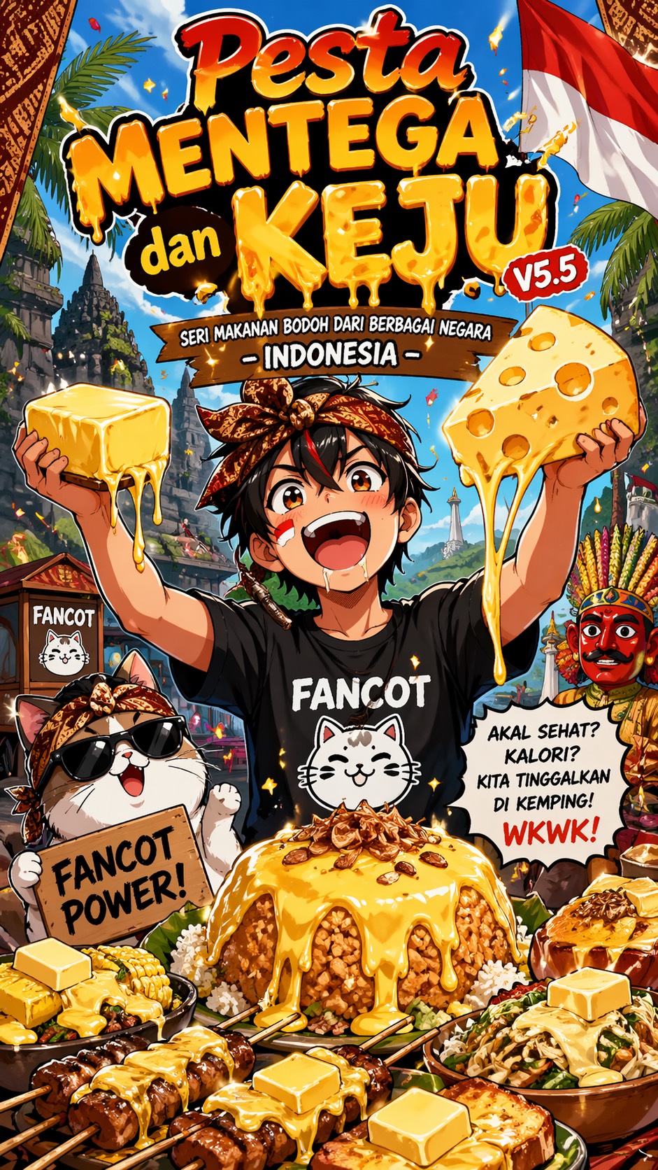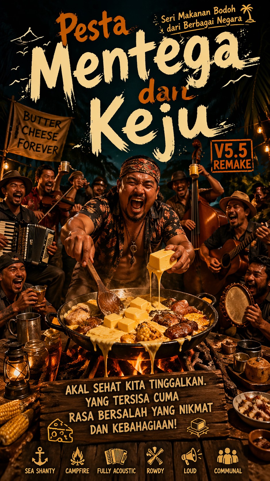 Indonesian Funkot Campfire Feast Anthem, Fast, Rowdy, Human, Chaotic And Joyfully Excessive, Front-And-Center Male Lead Vocal, Close-Miked, Dry, Loud, Pushy, Confident, Reckless, Like The Wildest Guy Cooking Beside The Listener, Not Polished, Elegant, Cute, Or Idol-Like, Fast Funkot Beat, Punchy Kick, Heavy Sidechained Sub-Bass, Rapid Cowbell Patterns, Syncopated Kendang-Style Percussion, Bright Synth Leads, Playful Plucks, Party Claps, Crowd Shouts, Keep The Groove Fully Funkot, Danceable, Hyperactive, And Slightly Ridiculous, Verses Feel Like Chaotic Cooking In Motion With Clear Diction, Choruses Are Communal Dance Drops, But Lead Vocal Stays In Front, Spoken Parts Are Close Outdoor Calls, Final Section Bigger, Faster, Dumber, More Glorious, No Rock, No Ballad, No Slow Tempo, No Elegant Lounge, No Cinematic Sadness
