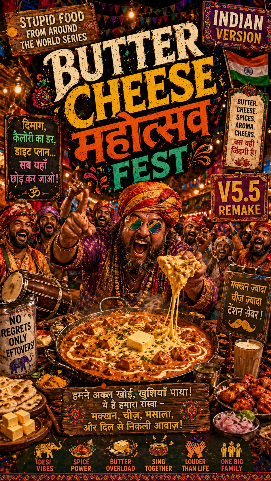 Indian Festival Street Feast Anthem, Bollywood Folk Energy, Fully Acoustic With Festive Percussion, Rowdy, Human, Loud And Communal, Front-And-Center Male Lead Vocal, Close-Miked, Dry, Pushy, Confident, Reckless, Like The Loudest Cook Leading A Street Crowd At Night, Not Polished, Elegant, Cute, Or Idol-Like, Dhol, Dholak, Tabla, Hand Claps, Foot Stomps, Large Metal Pot Hits, Harmonium, Sitar Or Sarangi Ornamentation, Crowd Shouts And Responses, Dense Festival Rhythm, Continuous Energy, No Silence Gaps, Strong Dhol Pulse, Call-And-Response Hooks, Repetitive Chant Lines, Rising Crowd Momentum, Verses Feel Like Chaotic Cooking In Motion With Clear Diction, Choruses Are Big Communal Festival Shouts, But Lead Vocal Stays In Front, Spoken Parts Are Close Outdoor Calls, Atmosphere Must Feel Like A Night Street Festival Full Of Heat, Spice, Butter, And Smoke, Crowded, Energetic, Slightly Overwhelming, No EDM, No Western Pop Structure, No Rock, No Soft Ballad, No Intimate Whisper, No Clean