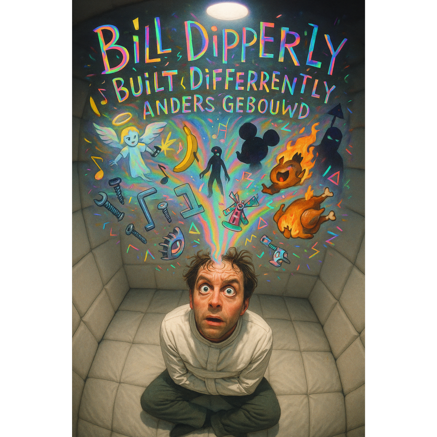 Chaotic Dutch theatrical dark-comedy song about an insecure singer with many inner voices, Music constantly switches style like a dramatic identity glitch, Extreme genre changes, sudden mood shifts, tempo jumps and emotional whiplash, Some moments should sound sweet, innocent and upbeat like a cute musical or cheerful cartoon, then immediately switch into dramatic classical tragedy, intense orchestral anxiety, creepy whisper-opera, chaotic dubstep meltdown, emotional pop ballad, goofy country parody, hyper EDM panic, then soft fragile lullaby, then back into explosive musical theater, Make it unpredictable, bipolar energy, sometimes beautiful, sometimes ridiculous, like a brain having technical difficulties, Fast sections, slow sections, sudden silence, exaggerated crescendos, glitch energy, comedy timing, dramatic pauses, Tone like Bo Burnham, Broadway meltdown, SpongeBob nightmare, and existential Pixar villain song combined, Silly, scary, tender, absurd, Dutch lyrics
