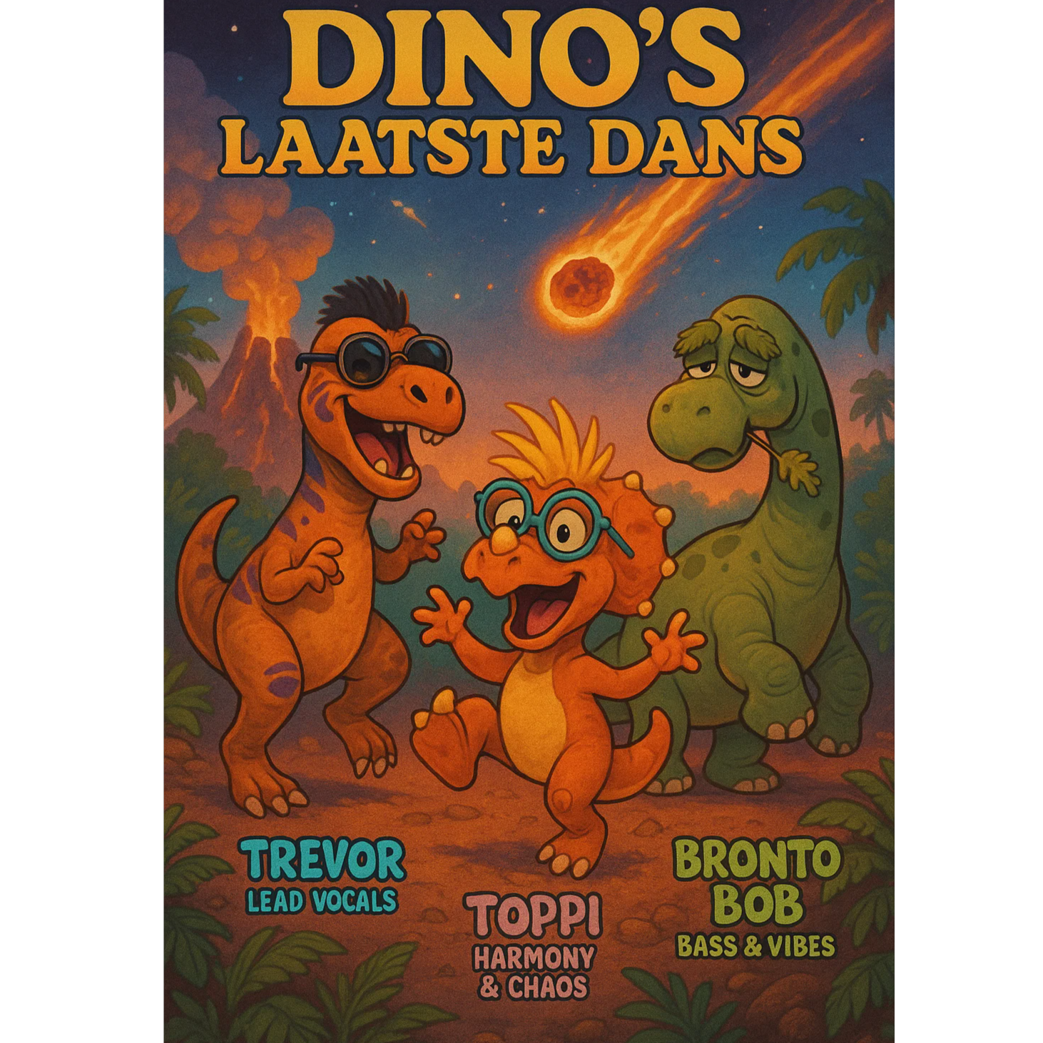 Funky disco groove, retro synths, slap bass, male comedic vocals, cartoonish sound FX – performed by a trio of characters: Rex (Tyranosaurus Rex) brings Afro-funk energy and rhythm, Toppi (Triceratops) adds quirky flair and playful chaos, and Bronto Bob (Brontosaurus) lays down slow, lumpy basslines and mellow vibes