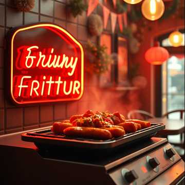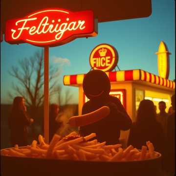 Vrolijk Vlaams volksnummer met speelse avonturensfeer, opgewekte straatcultuur, warme dorpsmentaliteit, humoristische Vlaamse beeldspraak, licht branievolle toon, knipoog naar Belgische frietkottraditie, ondeugende volkstaal, energiek en optimistisch verteltempo