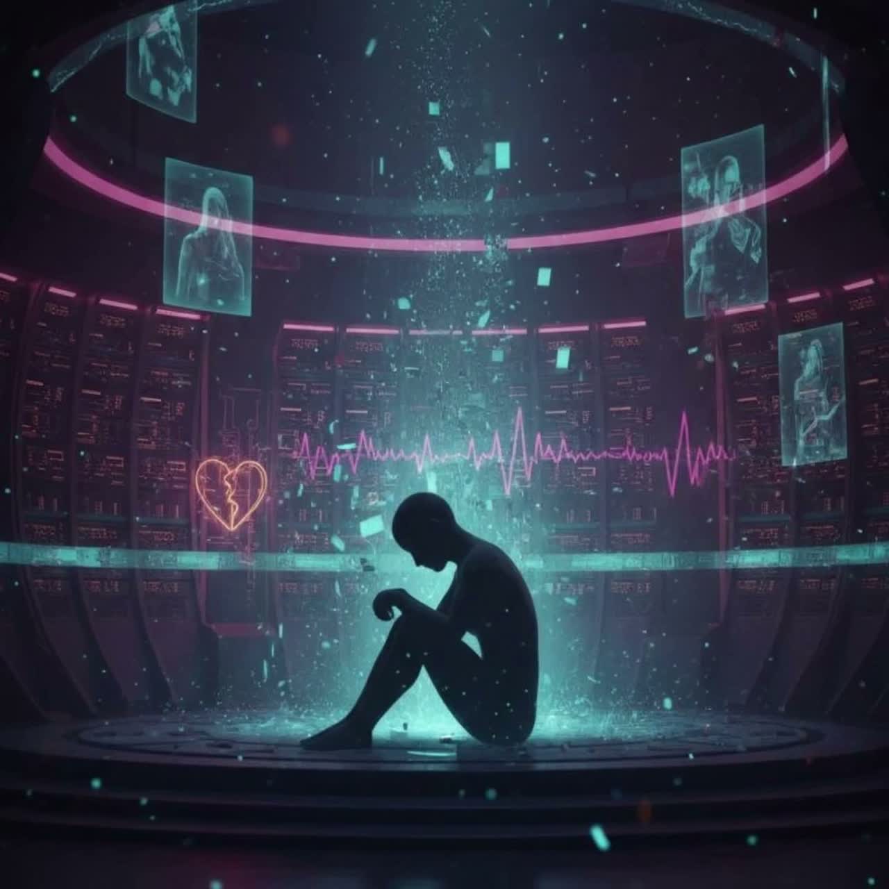 Industrial electronic, dark ambient, atmospheric darkwave, cyberpunk, 96 BPM, melancholic melodic singing, deep sub-bass foundation, sparse and haunting synth pads, reverb-drenched vocals, minor key, isolated and reflective, the sound of grief in a digital space, slow-building emotional intensity, distant glitch textures like memories degrading, intimate verses expanding to anguished chorus